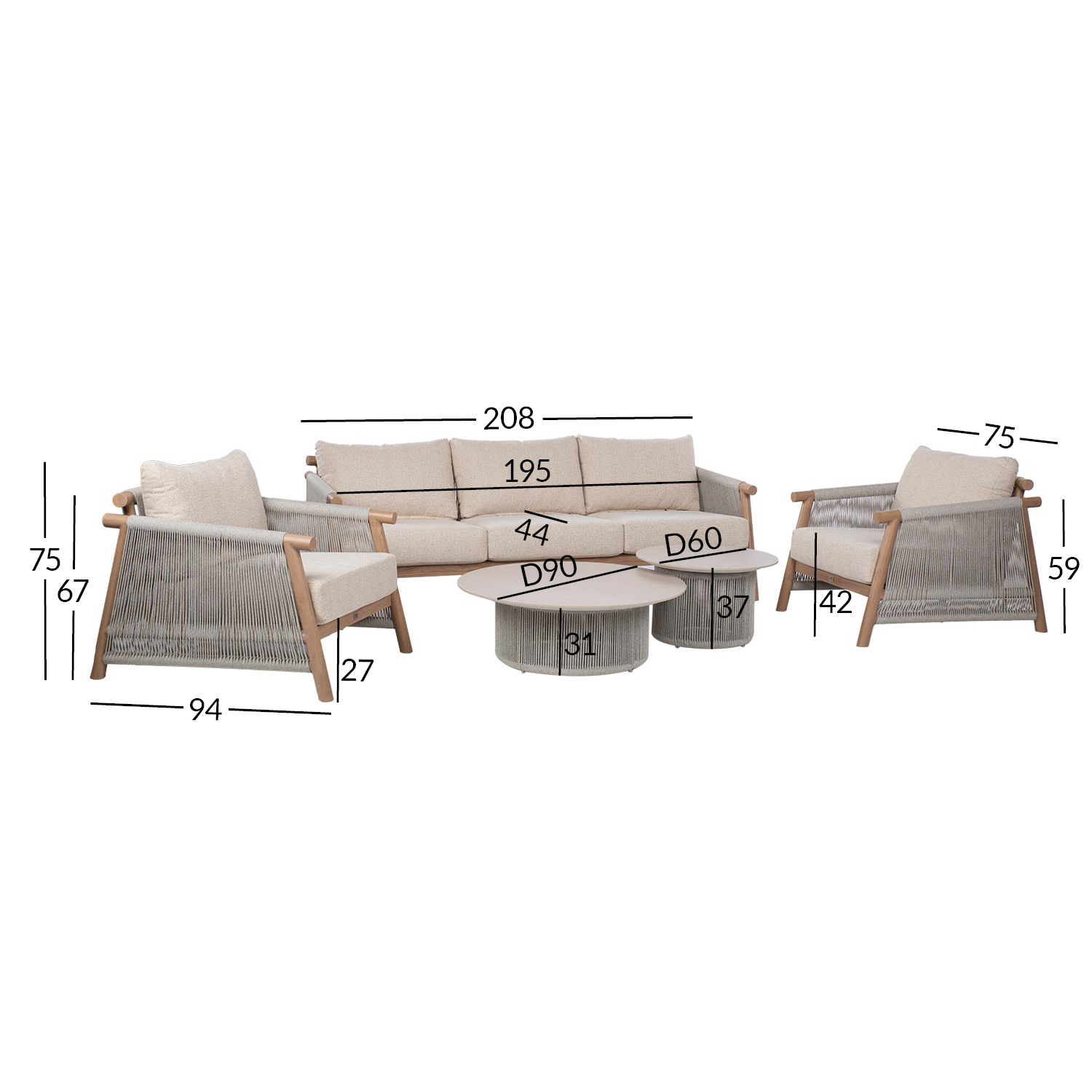 Aiamööblikomplekt DIANA diivan, 2 tugitooli ja 2 lauda, beež