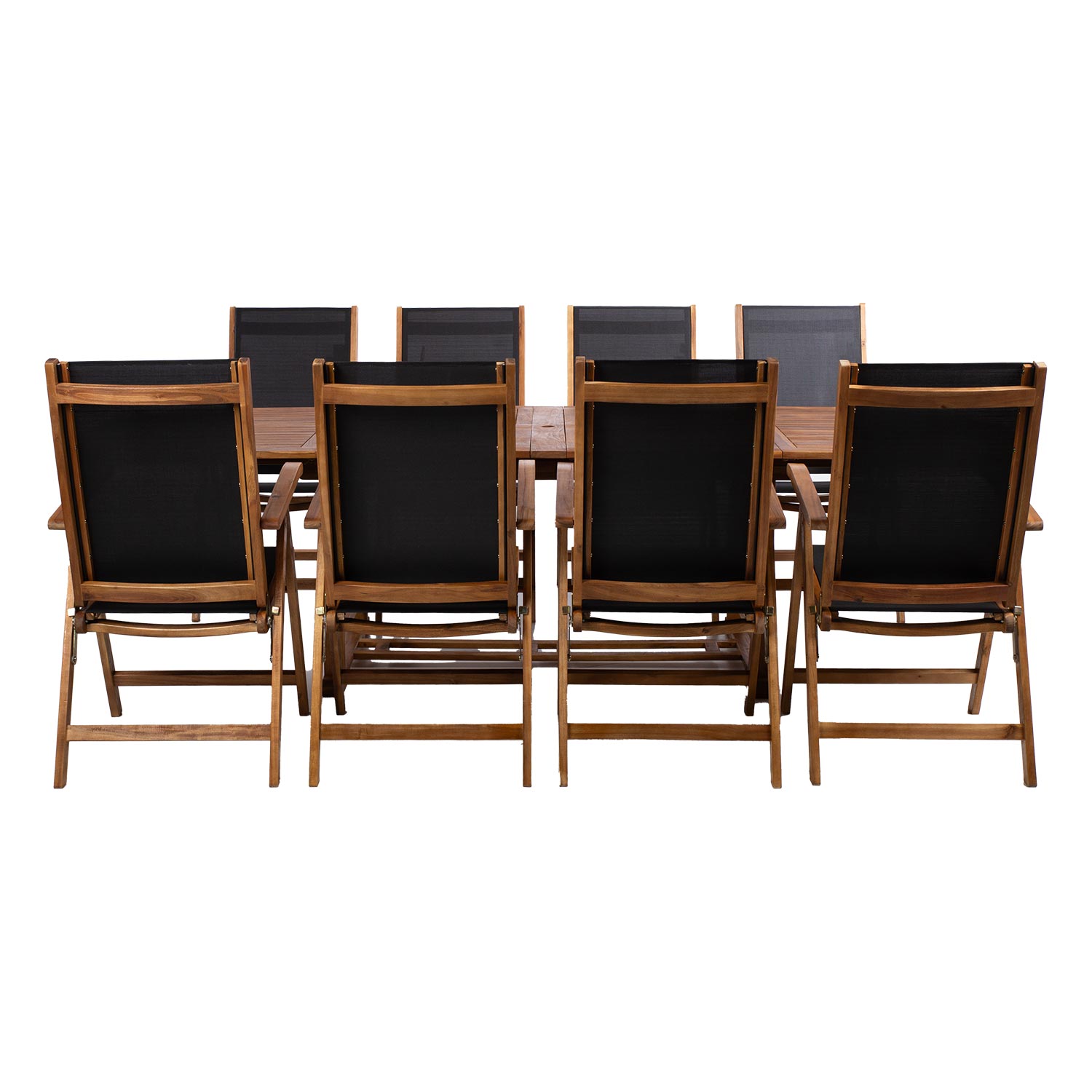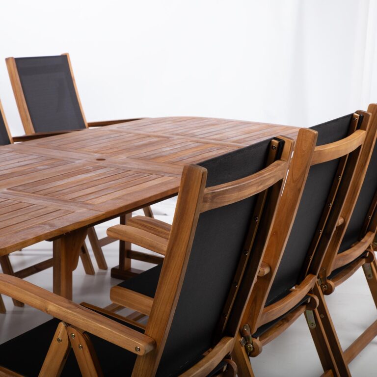 Aiamööblikomplekt FABIOLA laud ja 8 reguleeritava seljatoega kokkupandavat tooli.