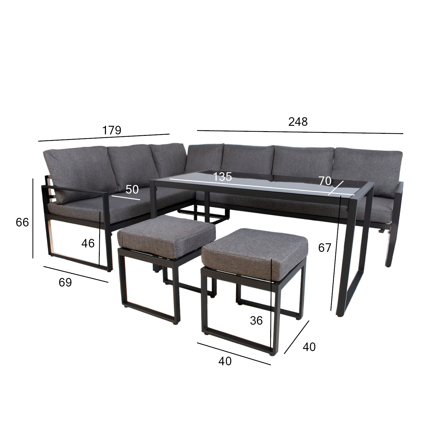 Tumbade mõõdud on 40x40xH36cm.