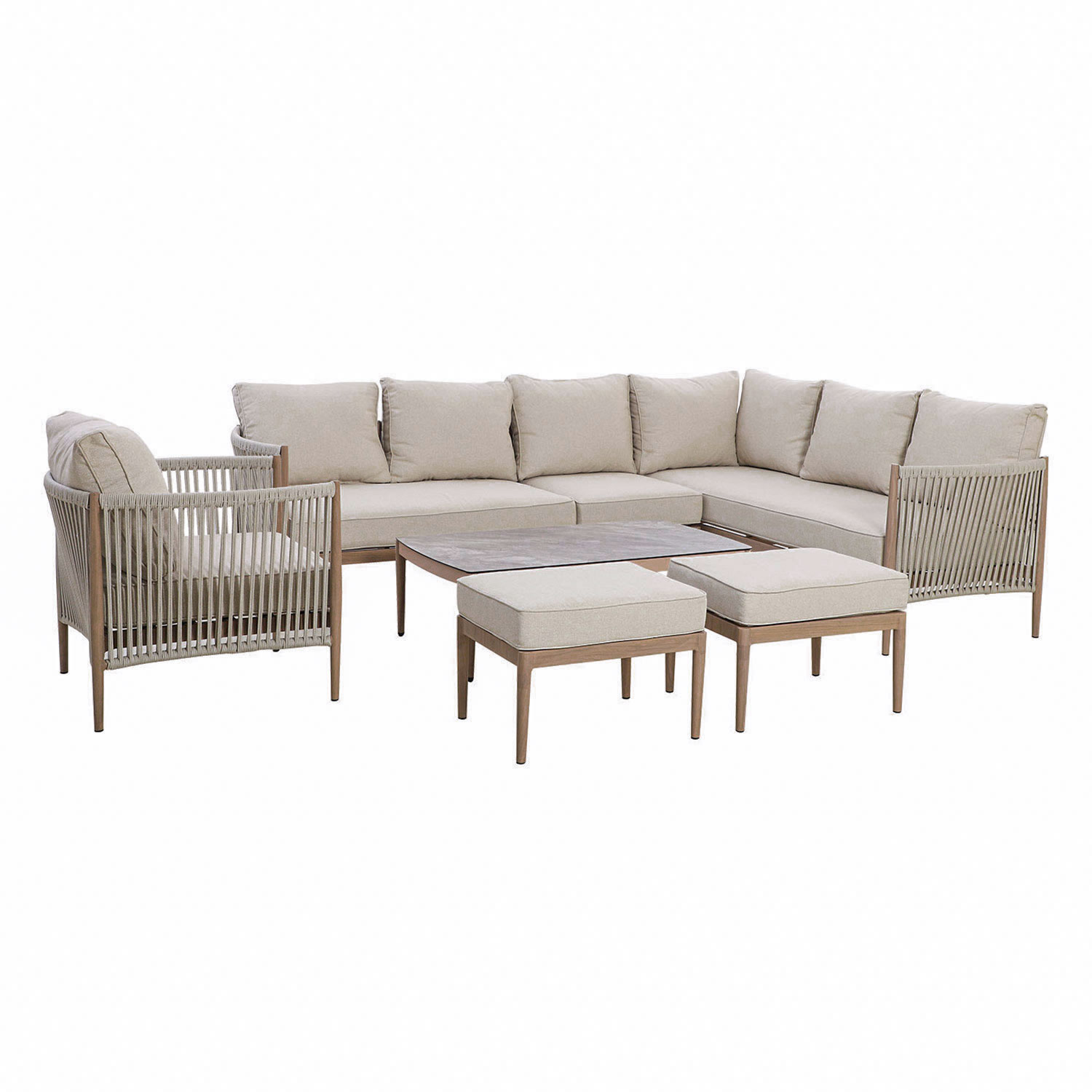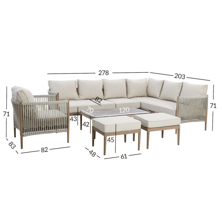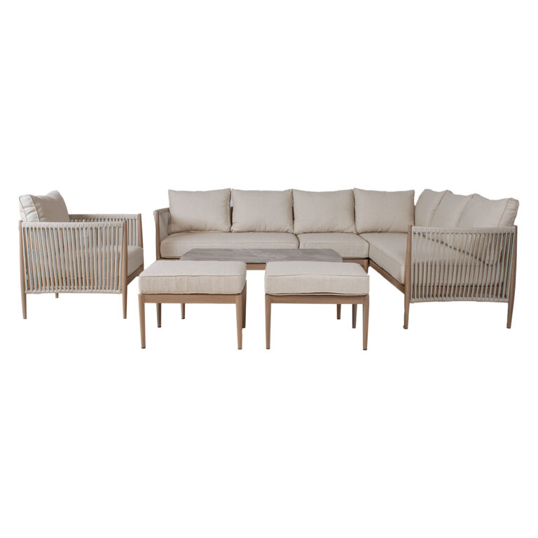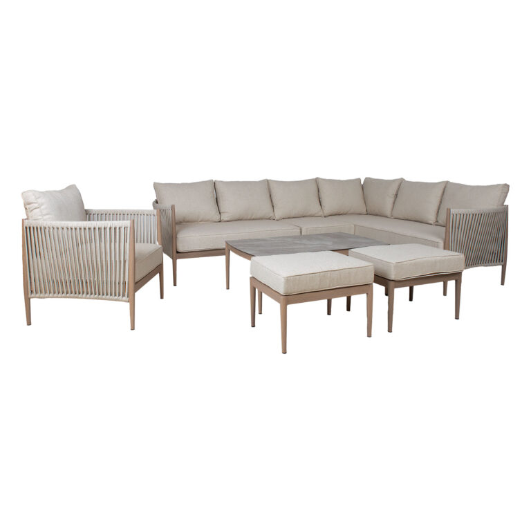 Aiamööblikomplekt MEDINA laud, nurgadiivan, tugitool ja 2 tumbat