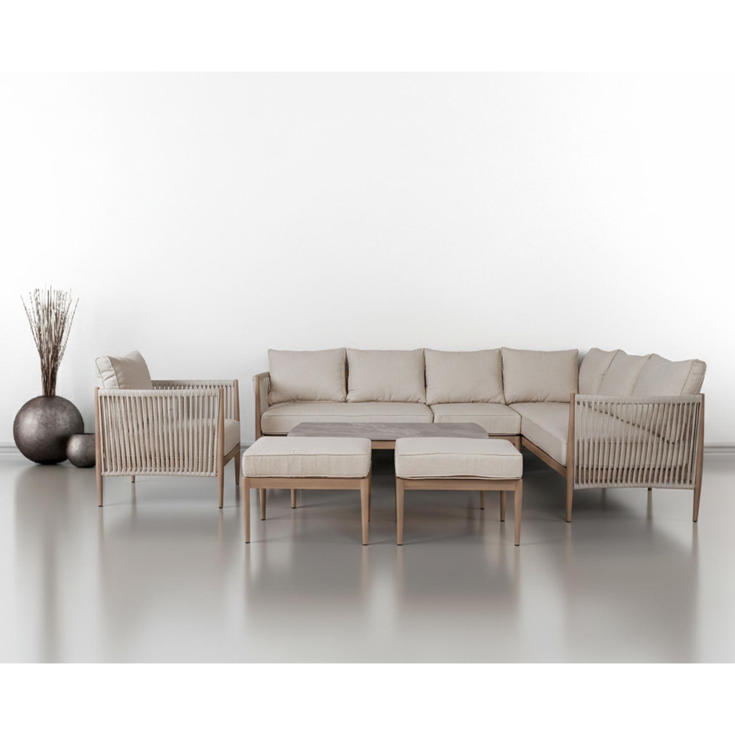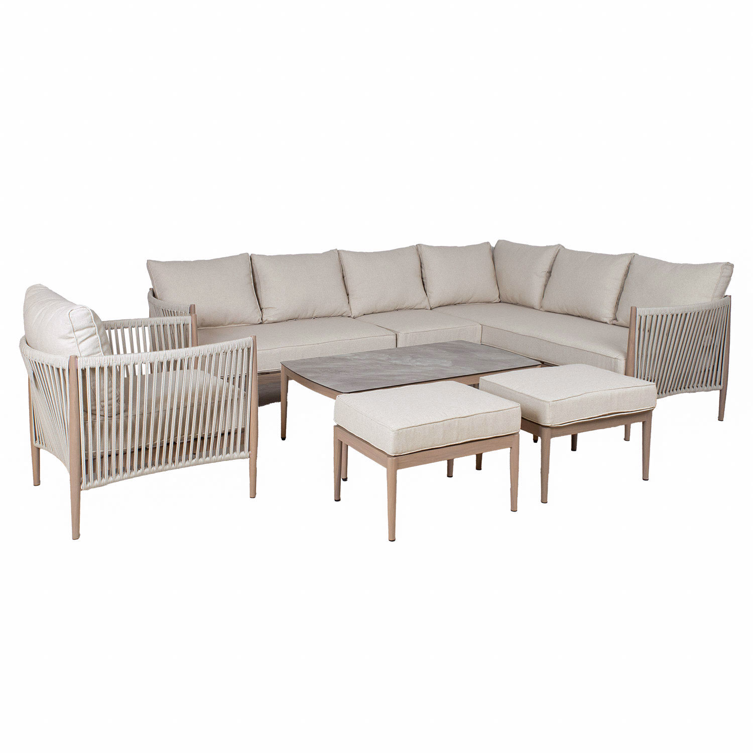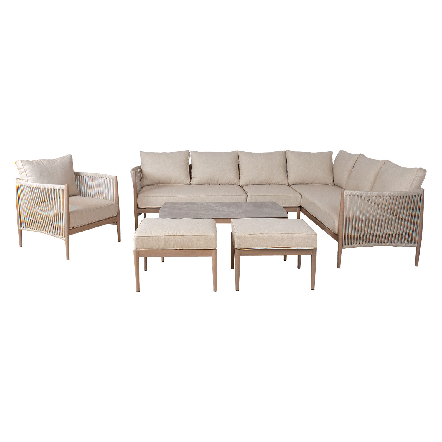 Aiamööblikomplekt MEDINA laud, nurgadiivan, tugitool ja 2 tumbat