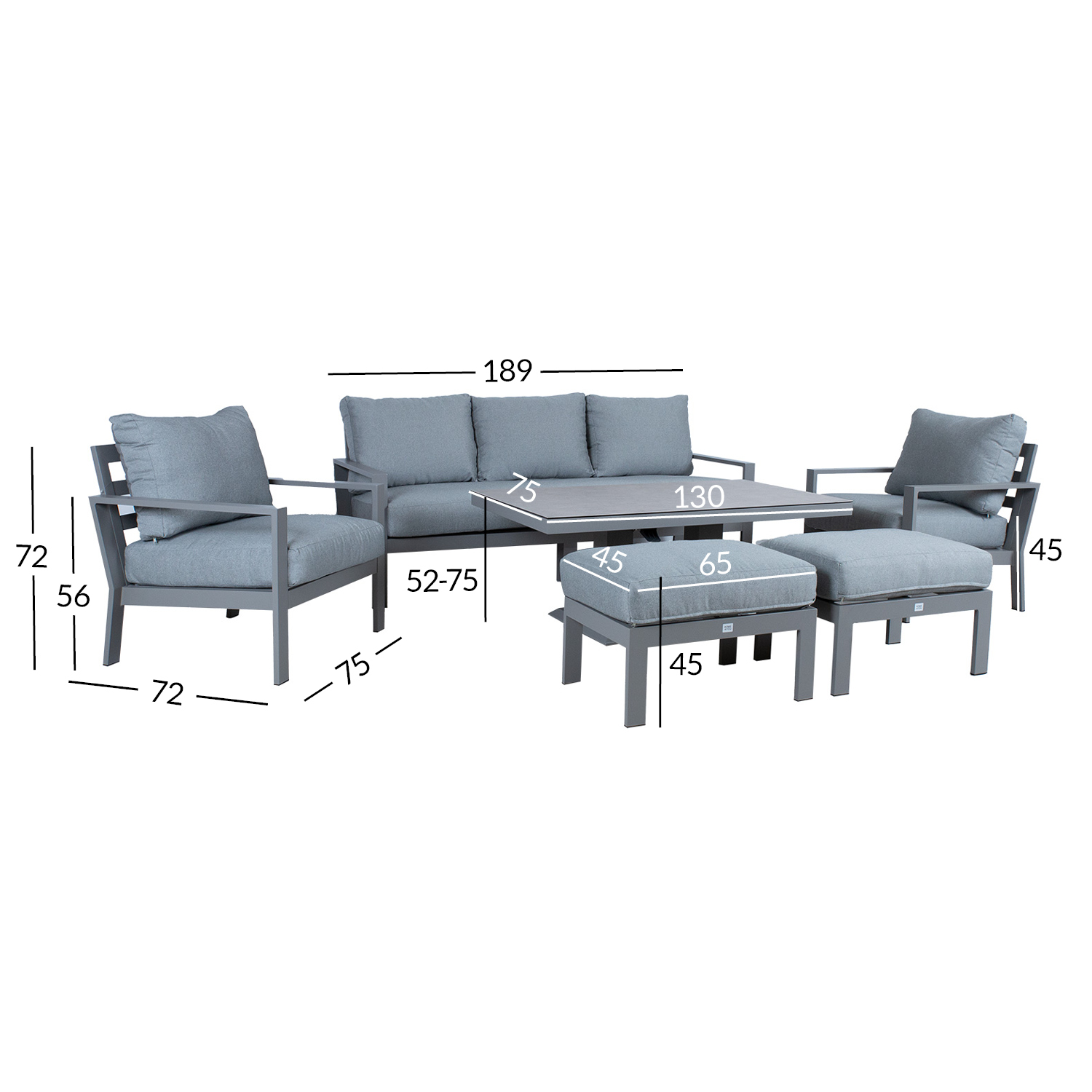 Tugitooli mõõdud: 75 x 72 x H72/87 cm. Istmepadi 60 x 60 x H15 cm, seljatoepadi 60 x 45 x 20 cm.