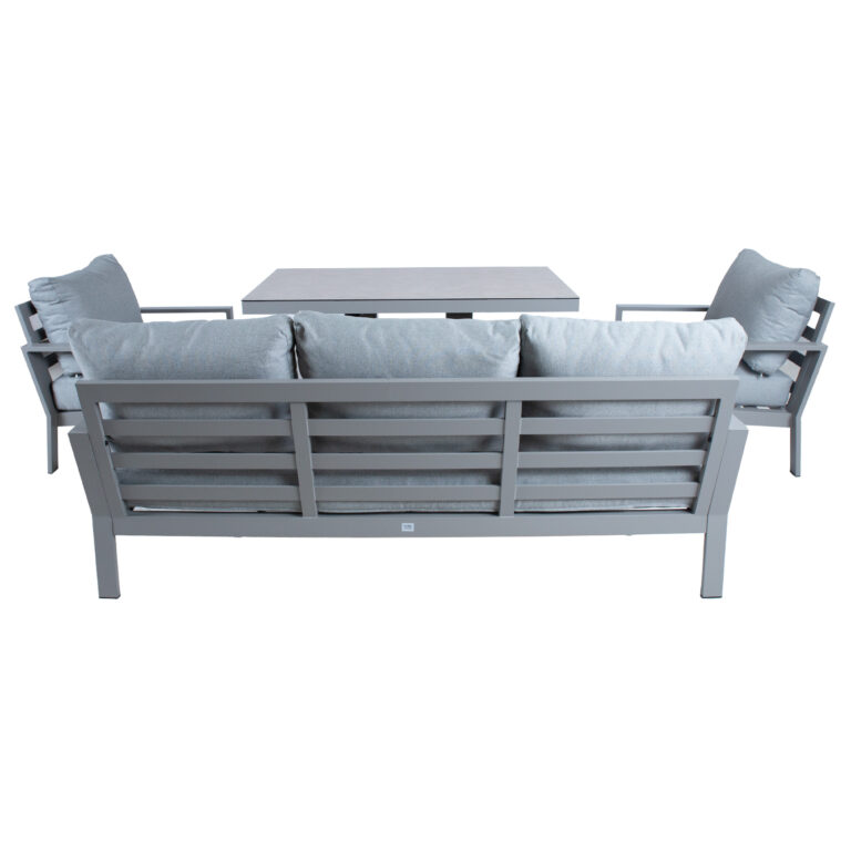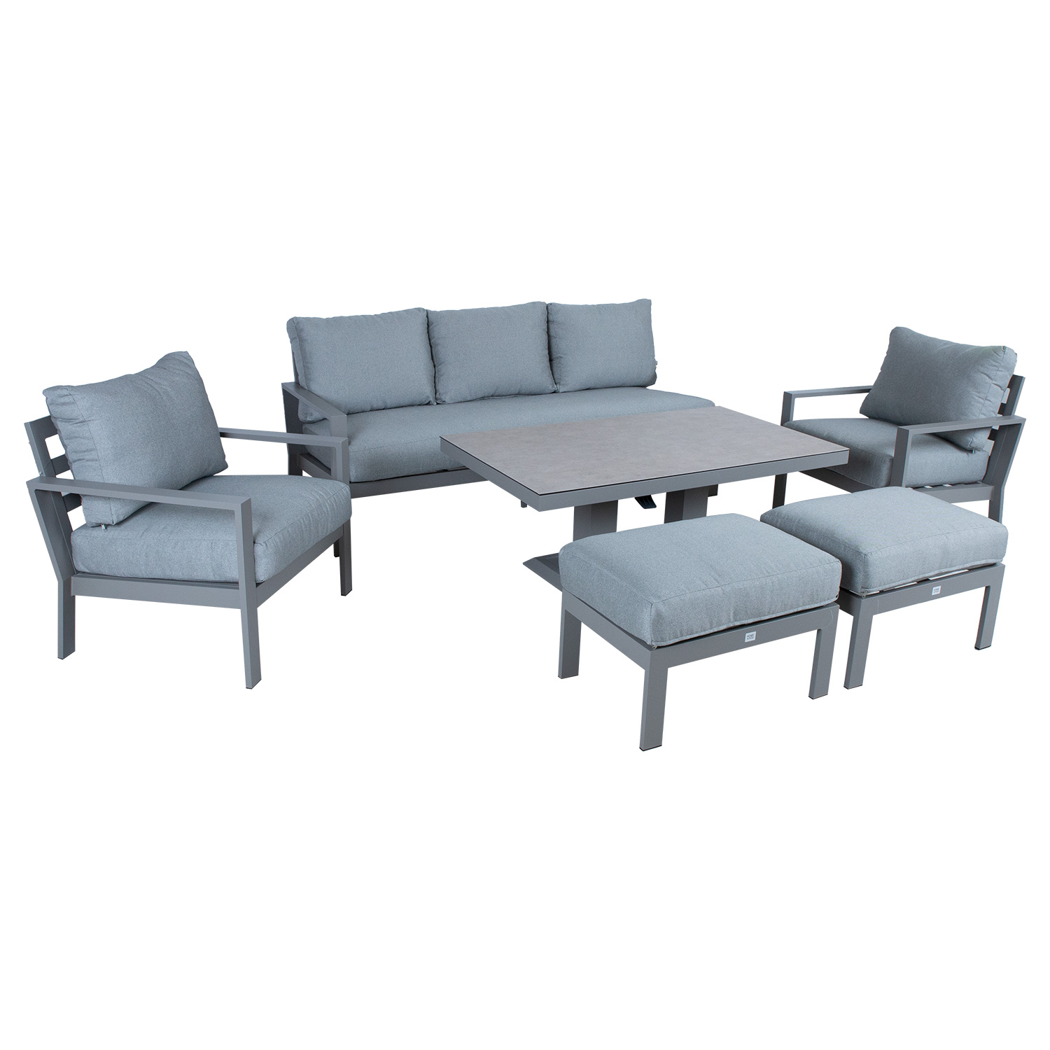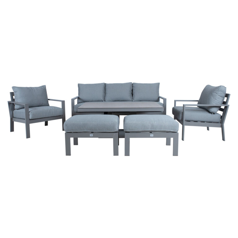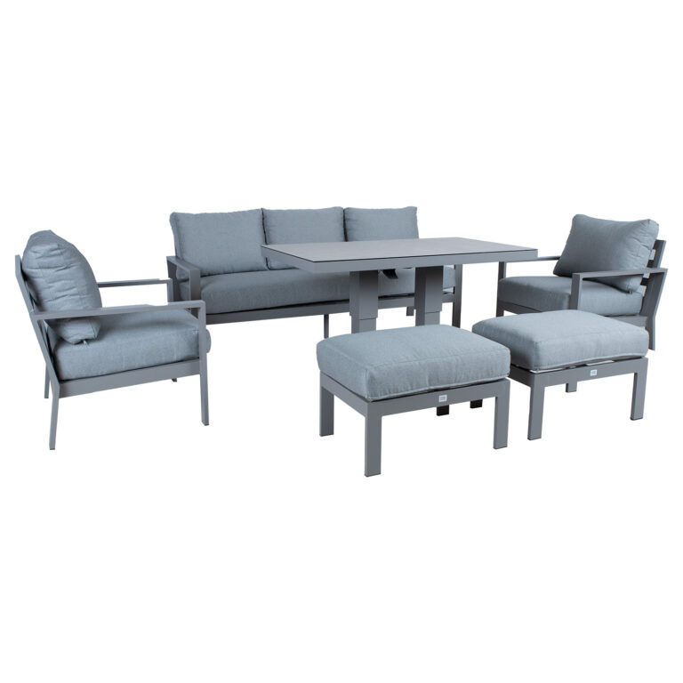 Komplekti kuulub muudetava kõrgusega laud, 3-kohaline diivan, 2 tugitooli ja 2 tumbat.