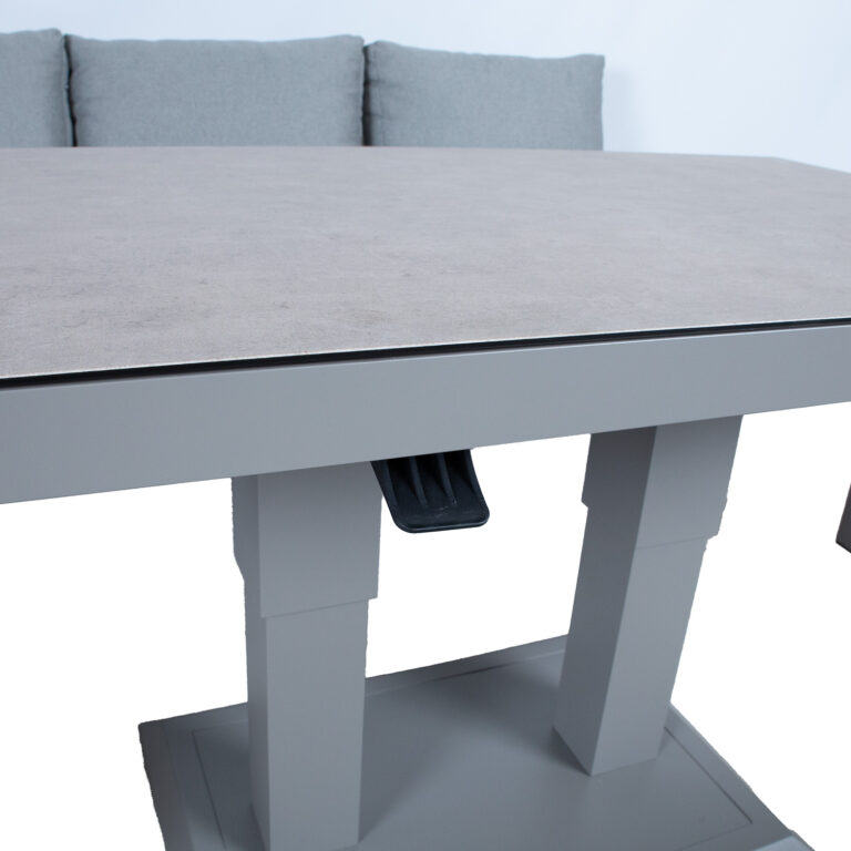 Laua mõõdud: 130 x 75 x H52-75 cm. Lauaplaat: 5 mm hall 3D prinditud klaas.