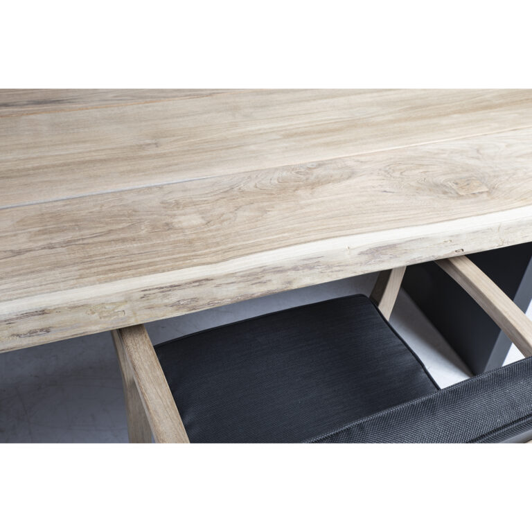 Peenlihvitud rustik viimistlusega pind on täielikult naturaalne oma looduslikus ilus ning seda ei ole õlitatud ega muul viisil keemiliselt töödeldud. Laua jalad on valmistatud alumiiniumist ja viimistletud halli pulbervärviga. A-klassi tiikpuu on täiuslik looduslik materjal luksusliku õuemööbli valmistamiseks. Puidu süü on tihe ja ühtlane ning kauni sametise läikega, värvus on kuldse nisu-ja meetoonides.