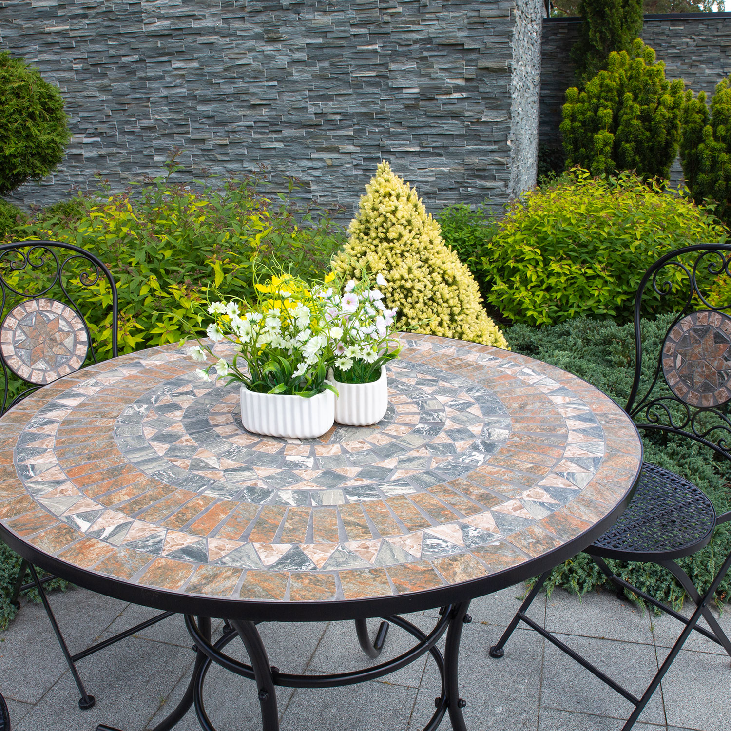Laua mosaaikplaat on kaunistatud pruunides ja hallides toonides keraamiliste plaatidega.
