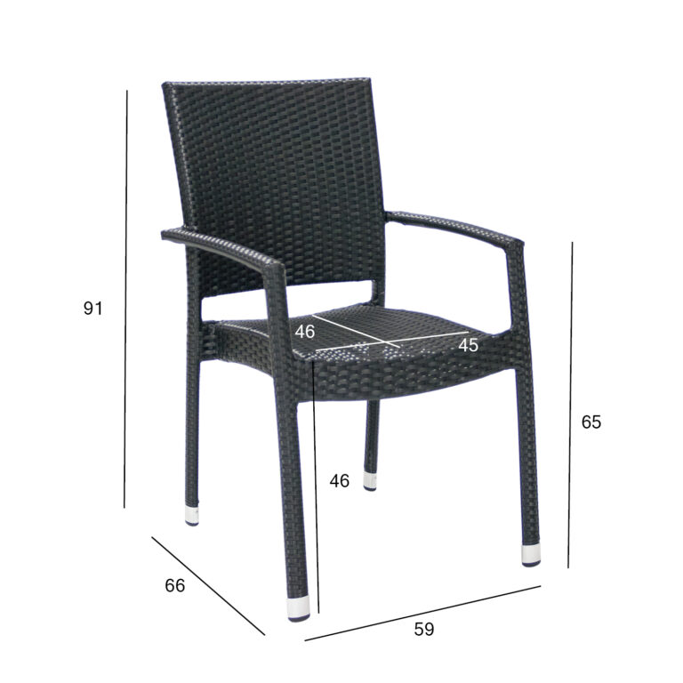 Tooli üldmõõdud on 59 x 66 x H91 cm. Istme laius 45 cm, istme sügavus 46 cm, istme kõrgus 46 cm. Seljatoe kõrgus 51 cm. Käetoe kõrgus maast 65 cm.