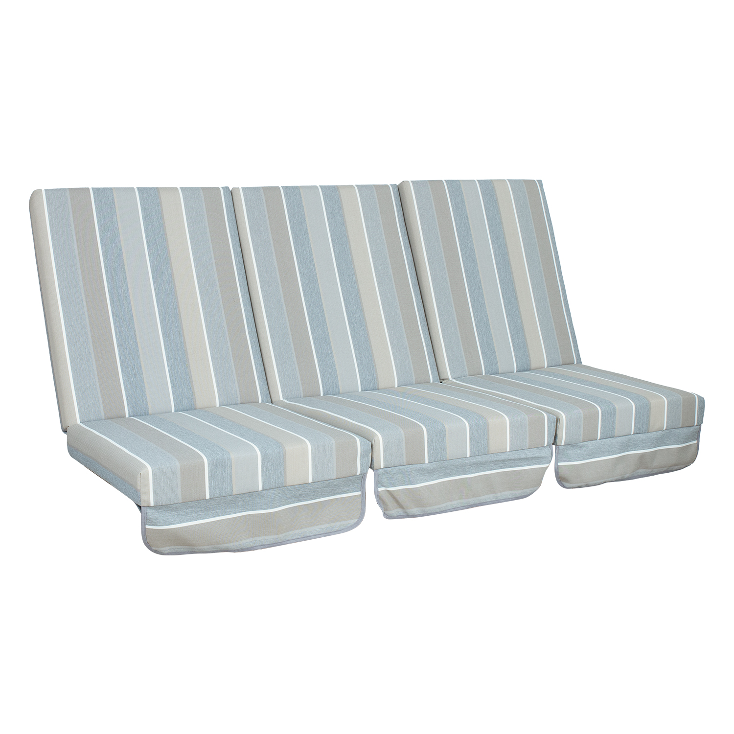 Kiigepadjad MONTREAL 114x52x9cm, 3tk, hall-beež triip. Sobib kiigeraamidele MONTREAL, CAIRO. Kangas 470, 100% polüester. Ühe padja mõõdud: laius 52cm, pikkus 114cm, paksus 9cm. Komplektis 3tk.