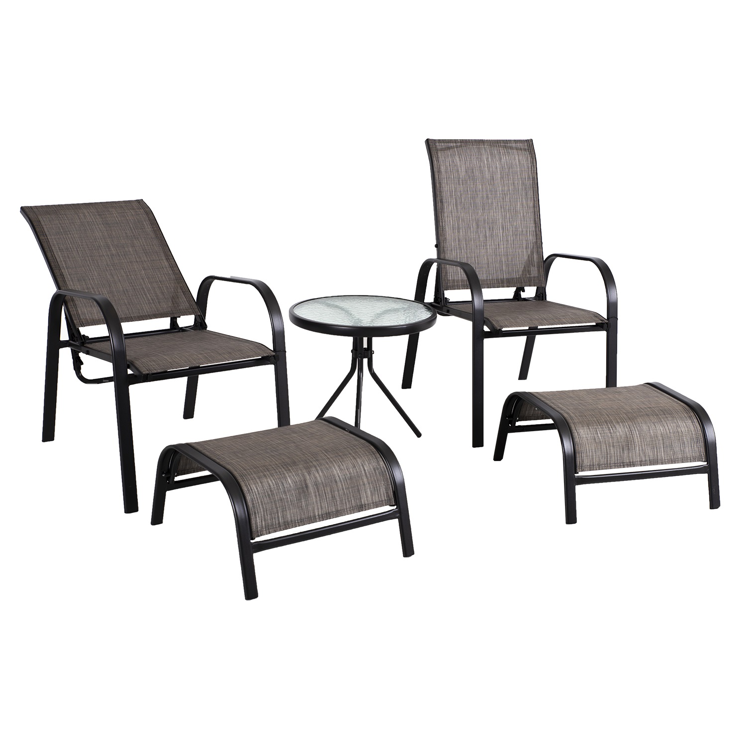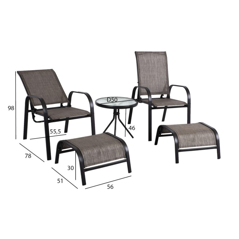 Aiamööblikomplekt DAKOTA laud, 2 reguleeritava seljatoega tooli ja 2 jalapinki.