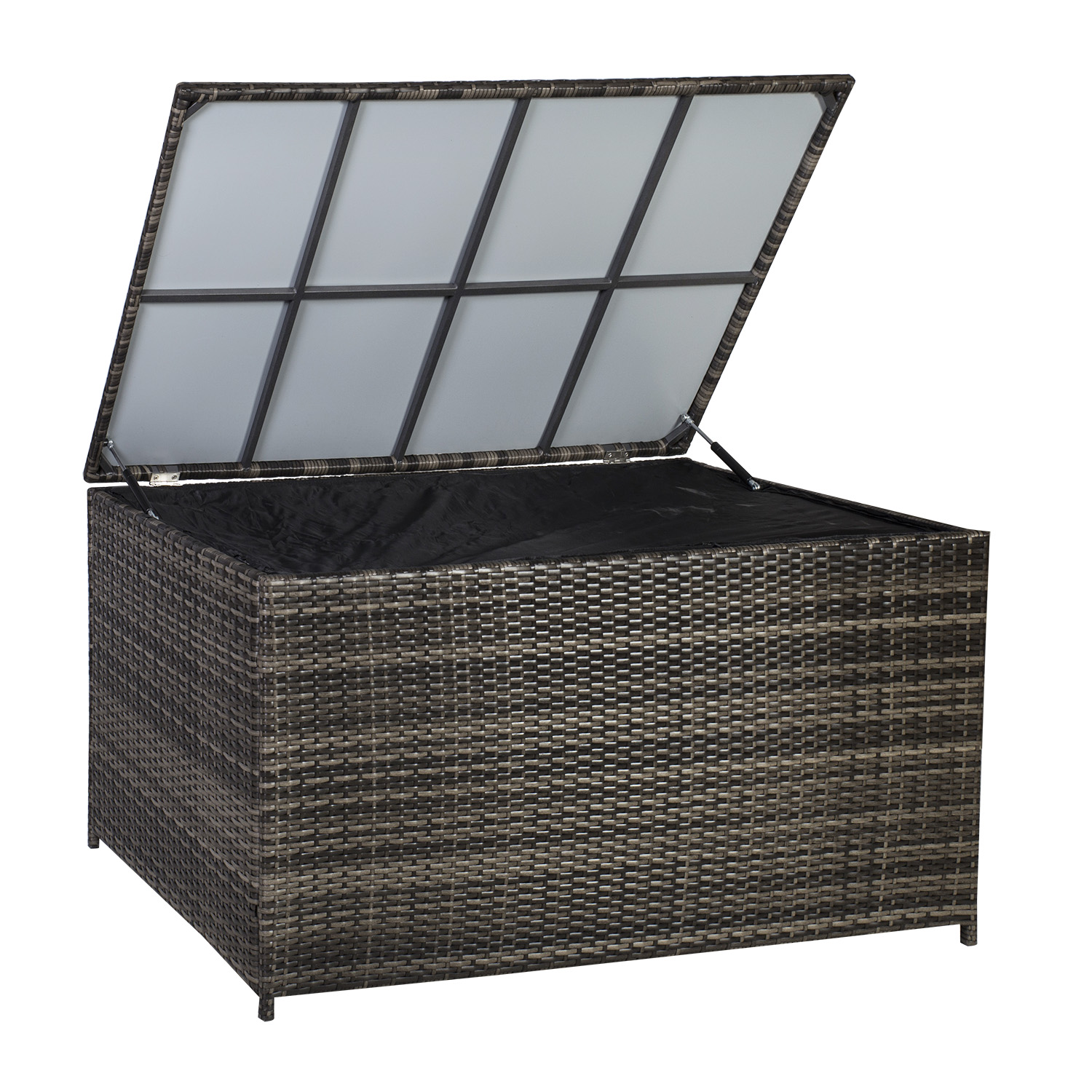Padjakasti terasraam on kaetud plastikpunutisega. Kasti sees on must polüesterkangast vooder.
