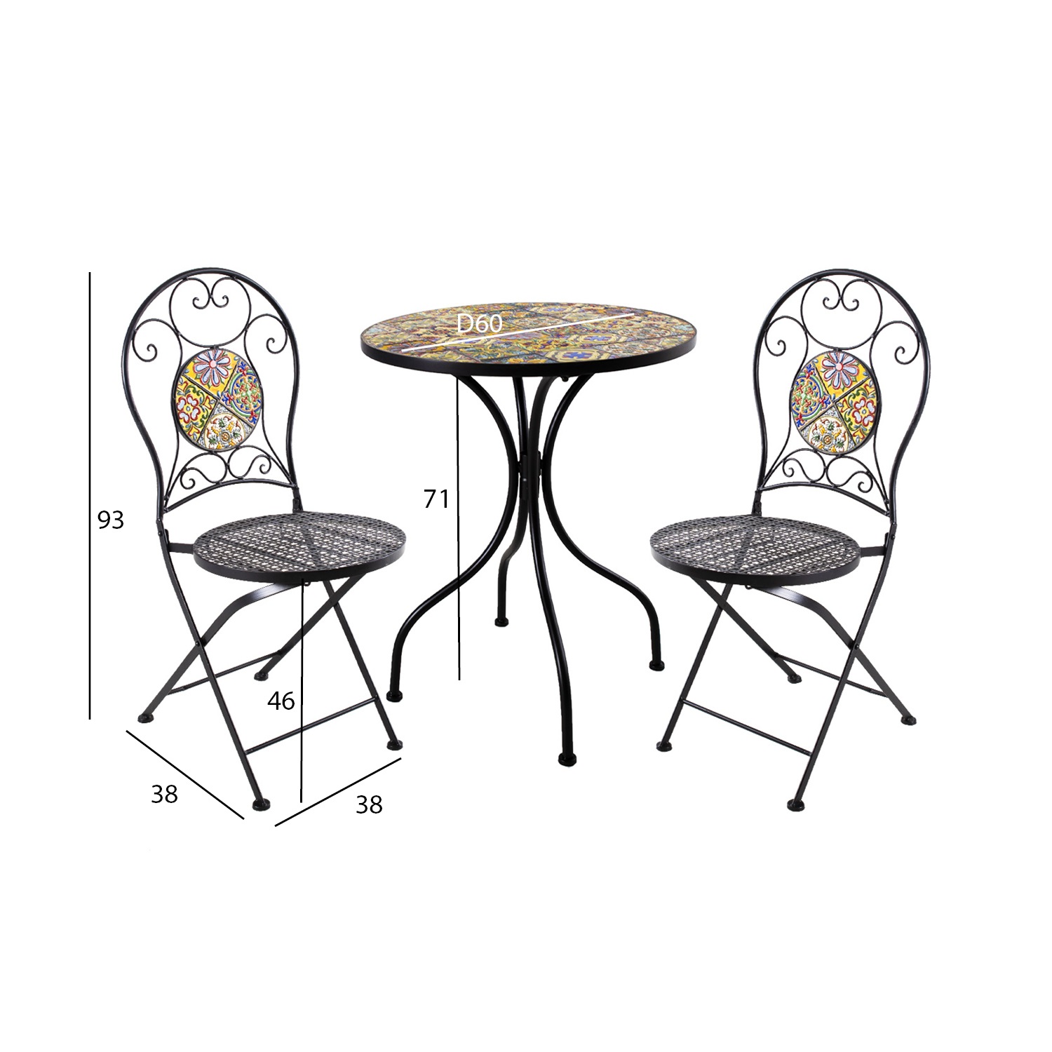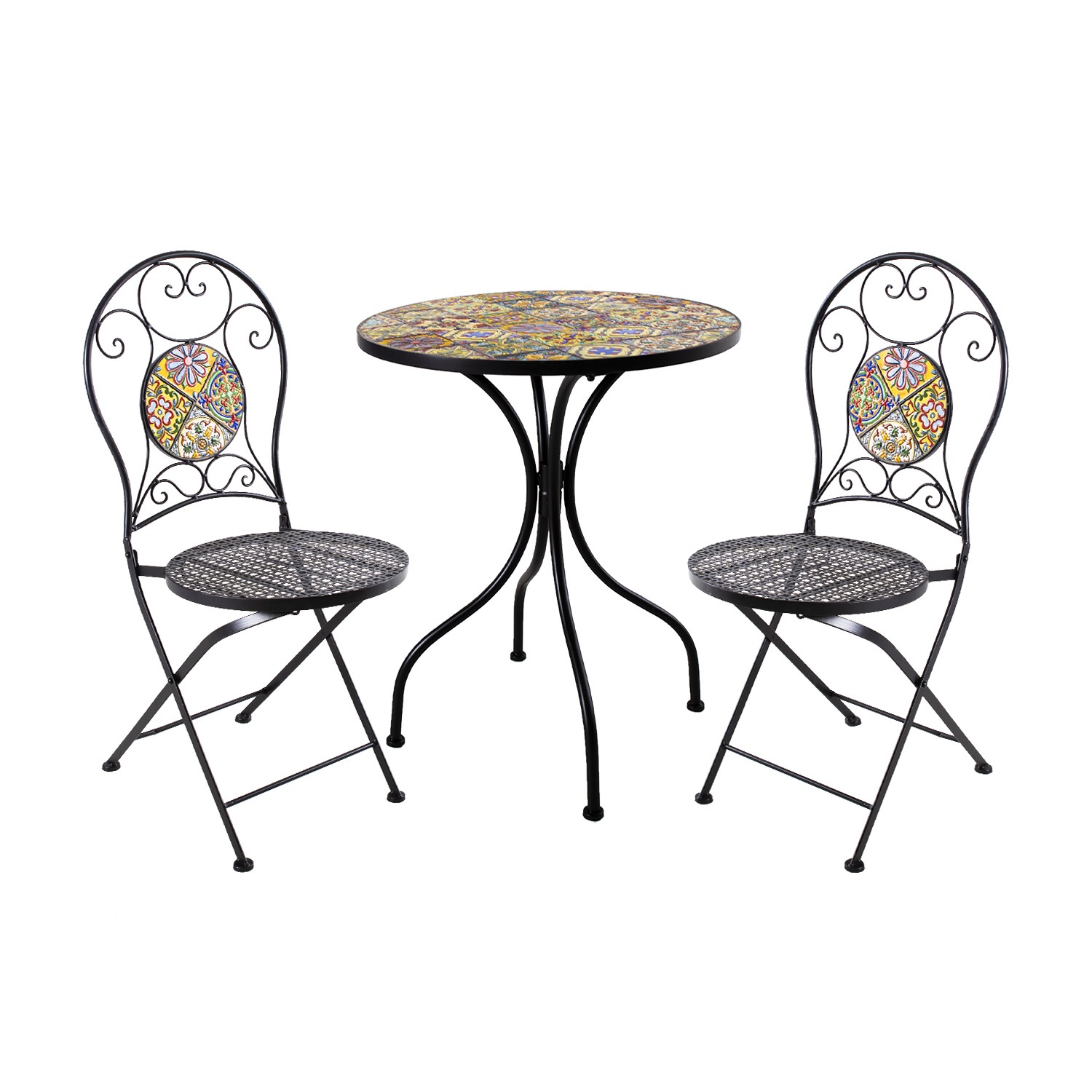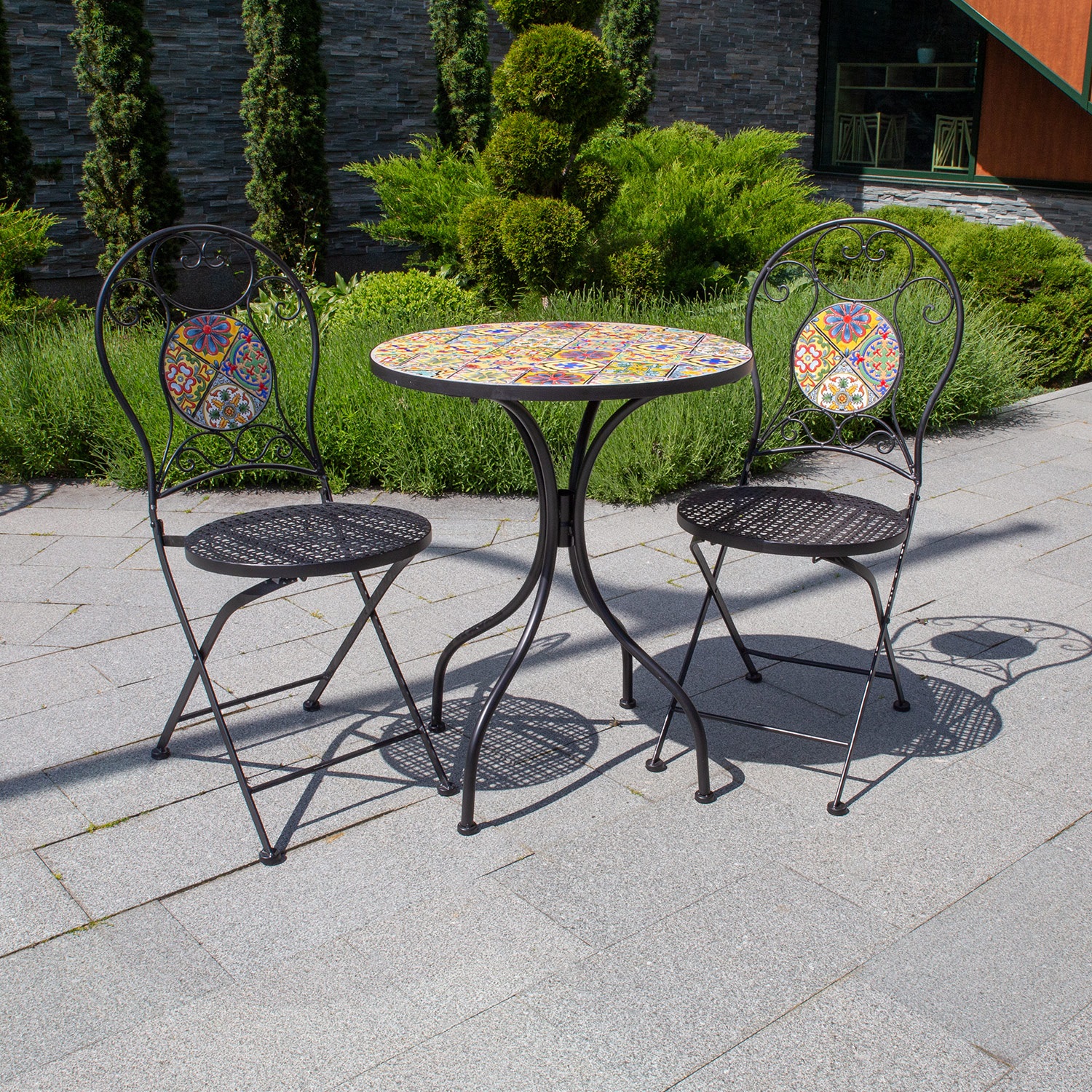 Laua mosaiikplaat ja kokkupandavate toolide seljatoed on kaunistatud Morocco stiilis värviliste keraamiliste plaatidega.