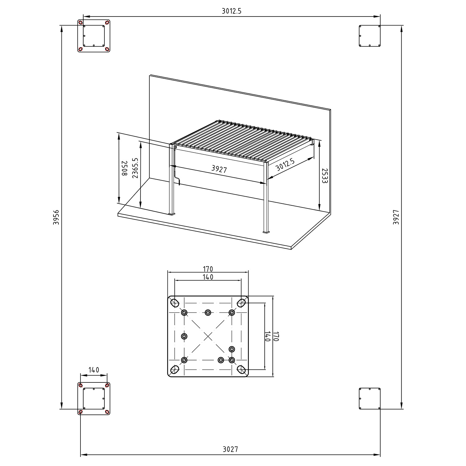 Varikatuse täpsed mõõdud: 3012,5 x 3927 x 2508/2533 mm.