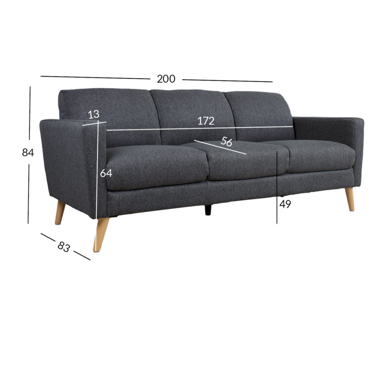 Diivani üldmõõdud on 200x83xH84cm. Istme laius 172cm, istme sügavus 56cm, istme kõrgus 49cm. Käetoe kõrgus maast 64cm, käetoe laius 13cm.