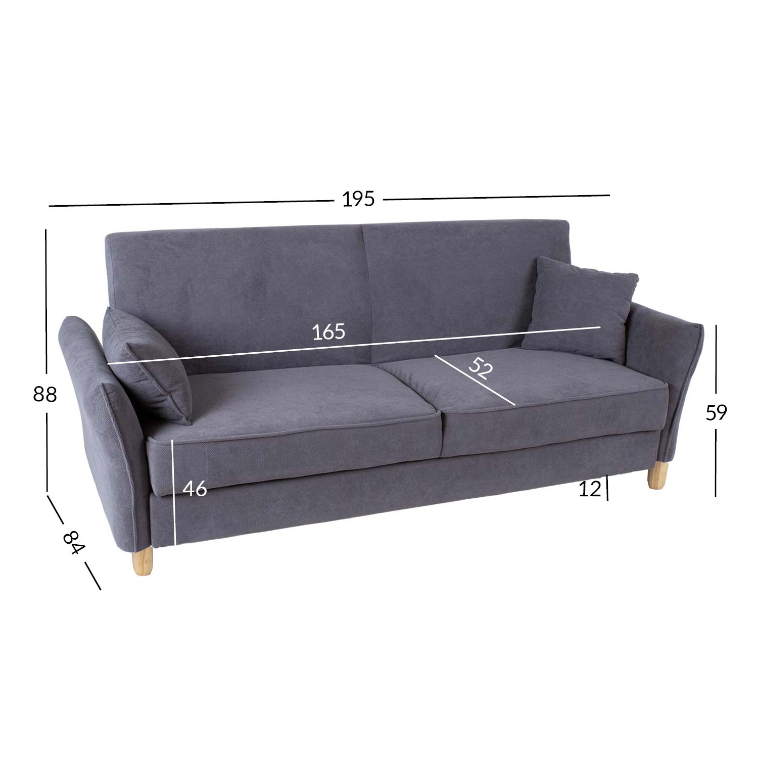 Diivani üldmõõdud on 195x84xH88cm, istme laius 165cm, istme sügavus 52cm, istme kõrgus 46cm. Käetoe kõrgus maast 59cm. Magamisosa mõõdud avatuna on 165x105xH46cm.
