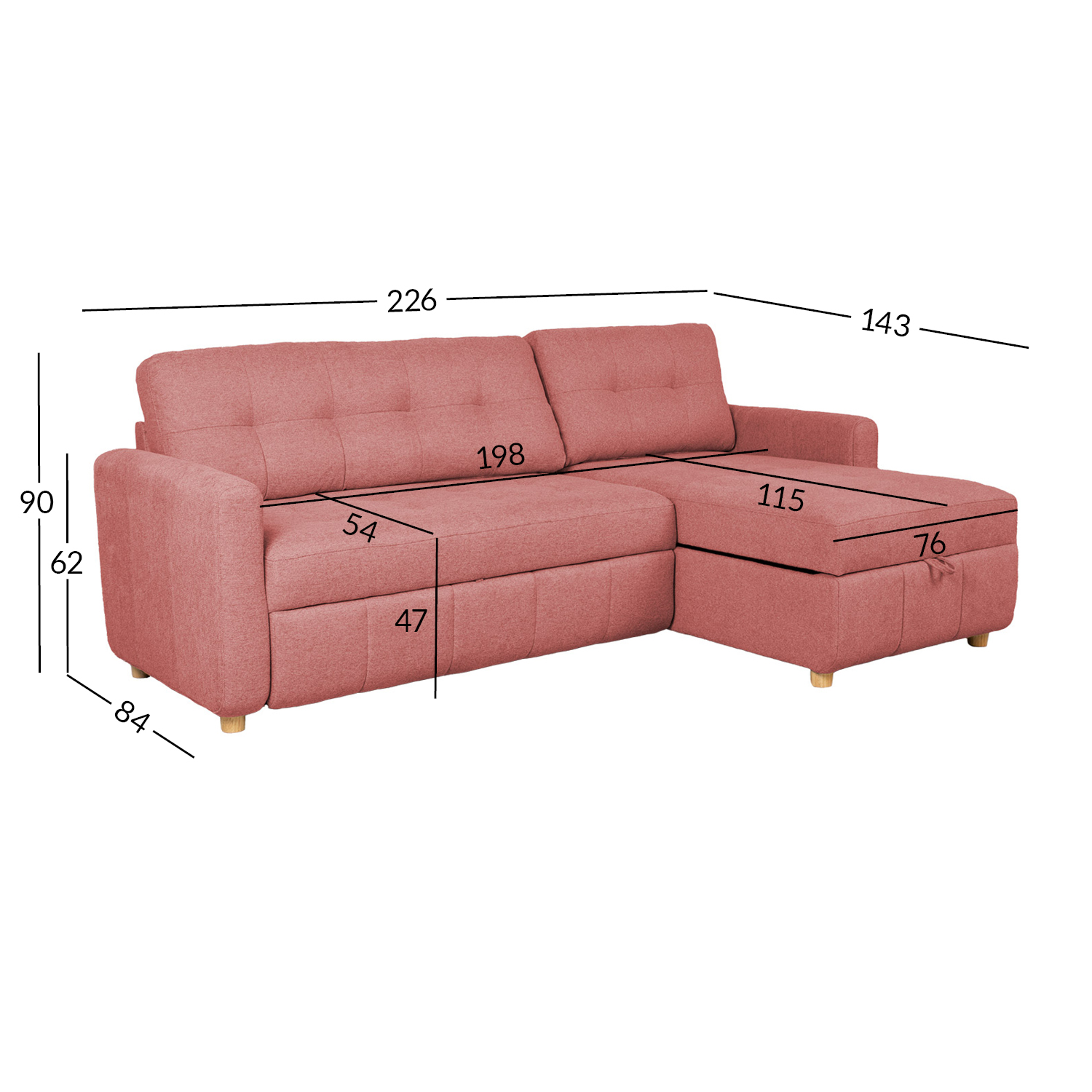 Diivani üldmõõdud on 226×84/143xH90cm. Istme laius 124+74cm, istme sügavus 54/115cm, istme kõrgus 47cm. Käetoe kõrgus maast 62cm.