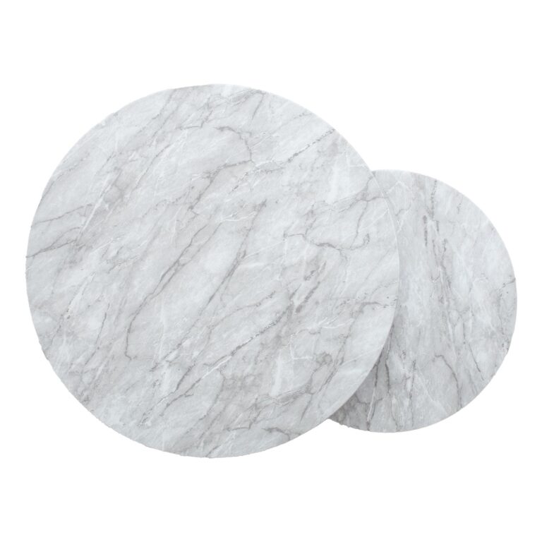 Diivanilaud AKIRA 2tk D80xH45cm, D60xH37cm, helehall. Lauaplaat: marmori dekooriga laminaatplaat. Laua jalad ja alusraam on valmistatud terasest ja viimistletud musta pulbervärviga.