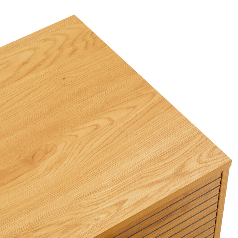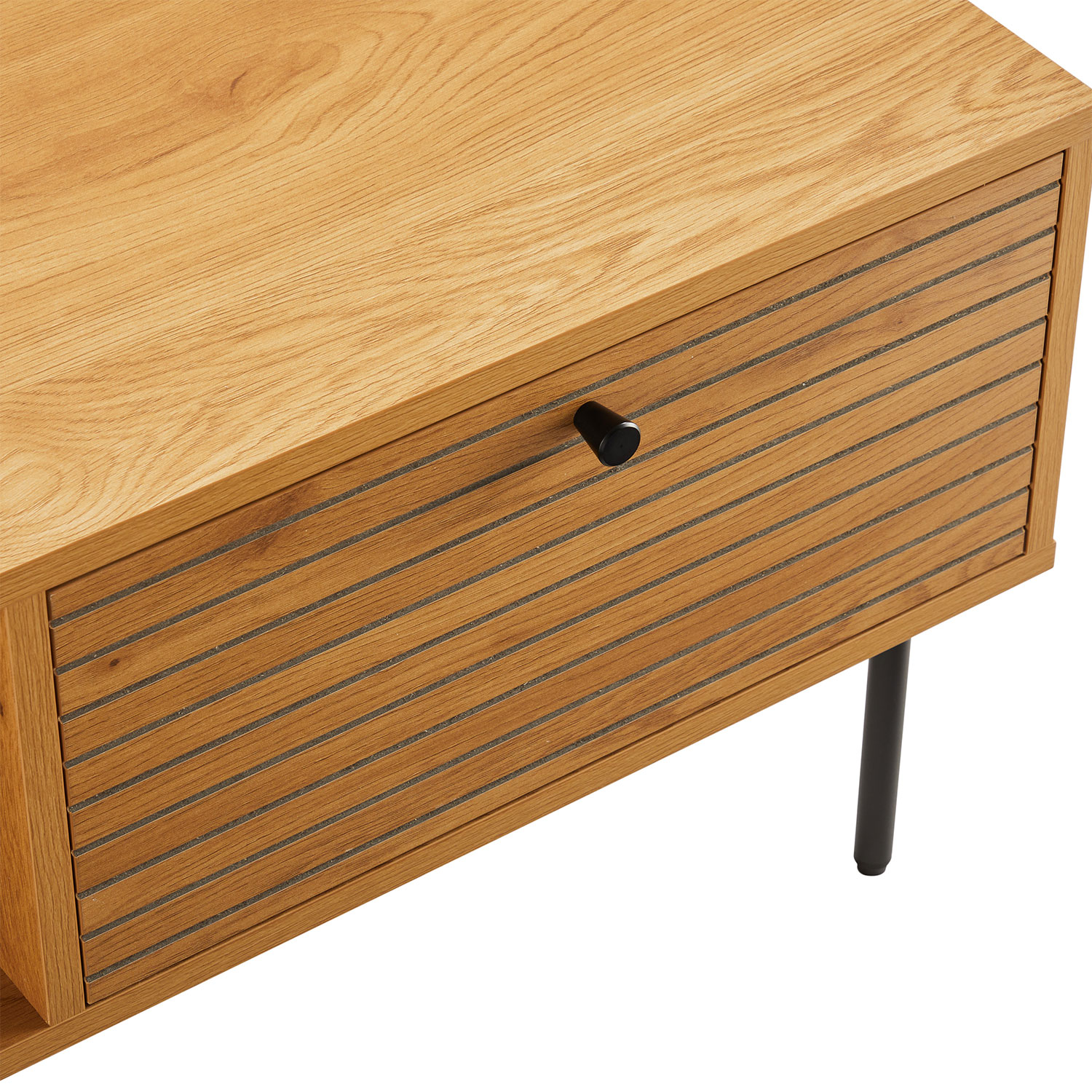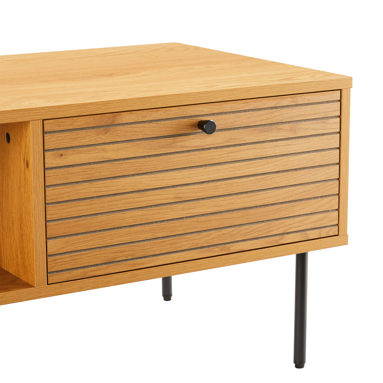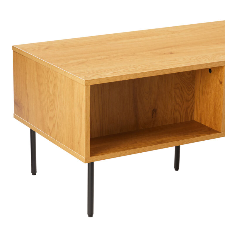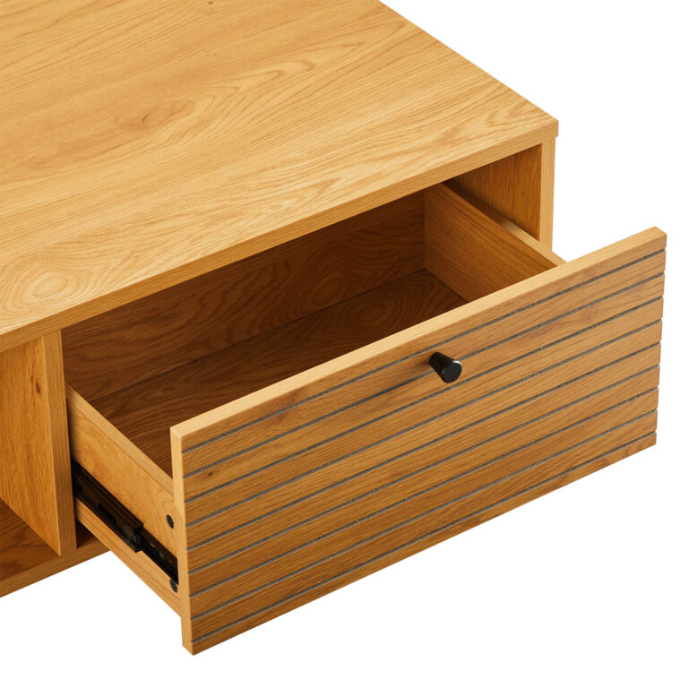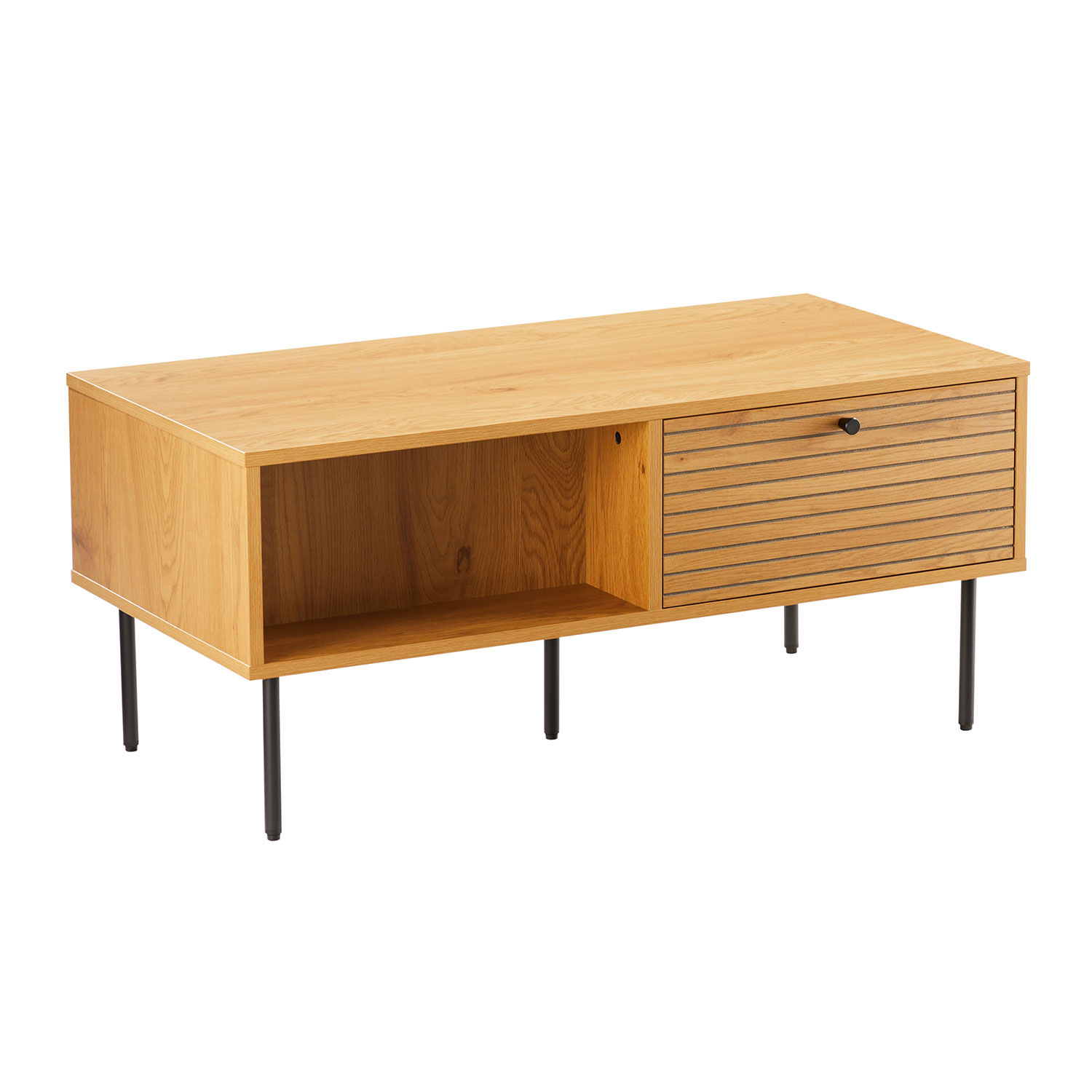 Diivanilaud LINE 2-sahtli ja 2-riiuliga 100x50xH45cm. Laud on valmistatud tammedekooriga melamiinplaadist. Efektsed reljeefse pinnaga triibulised sahtlite esipaneelid on valmistatud mustast MDF plaadist, mida kaunistavad tammevärvi kitsad liistud. Laua metallist jalad on viimistletud musta pulbervärviga.