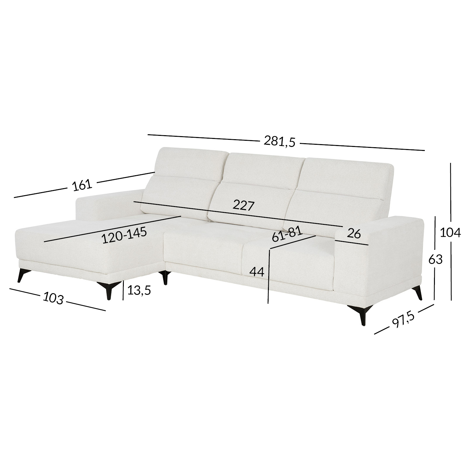 Nurgadiivan DARLA. Diivan on kaetud vastupidava polüesterkangaga, 400g/m², Oeko-Tex standard. Kattematerjali kulumiskindlus: 50000 Martindale’i. Diivanil on siksak vedrustus. Diivani konstruktsioon on valmistatud puidust, vineerist, OSB-plaadist, puitlaast- ja puitkiudplaadist. Diivanijalad on valmistatud metallist. Istme kõrgus on 44cm, istme sügavus on 61/81cm, istmeosa laius on 227cm. Käetugede kõrgus on 63cm ja laius 26cm. Jalgade kõrgus on 13.5cm. Toote mõõdud on 281,5×161/97,5xH104cm. HOOLDUS: puhastamiseks kasutage tolmuimejat. Kõik plekid või mustus tuleb viivitamatult puhastada neutraalse seebilahusega, hõõrudes lapiga sujuvate ringjate liigutustega.