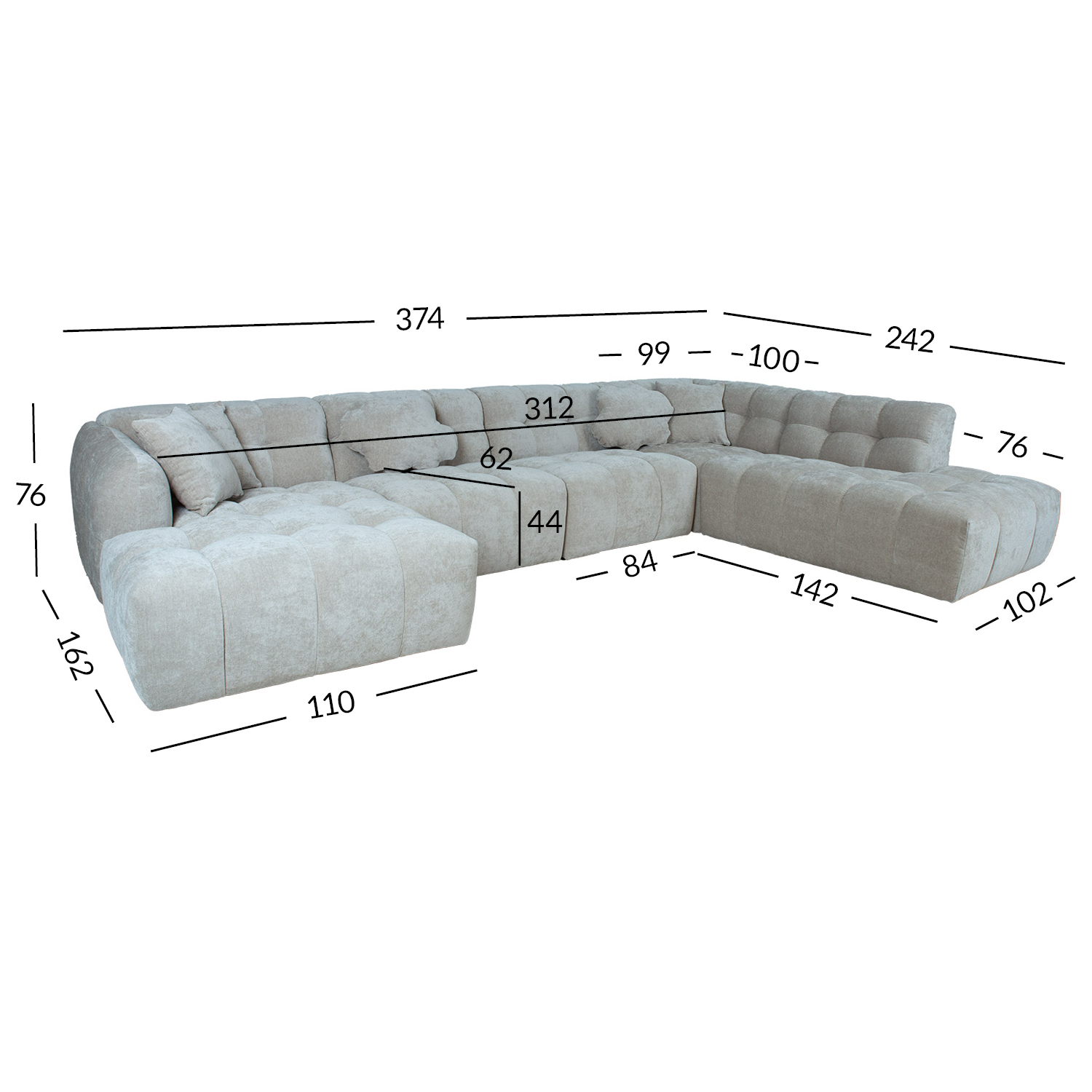Diivani üldmõõdud on 374 x 162/242 x H76 cm.