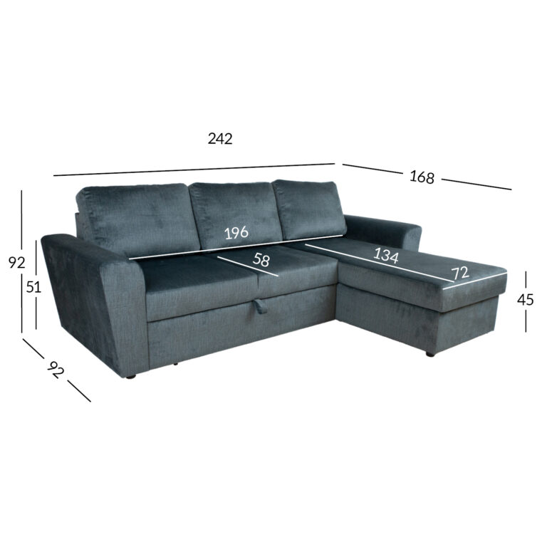 Diivani üldmõõdud: 242×168/92xH92cm. Istme laius 196cm, Istme sügavus 58/134cm, istme kõrgus 45cm. Diivani kõrgus raami ääreni 73cm. Käetoe kõrgus maast 51cm.