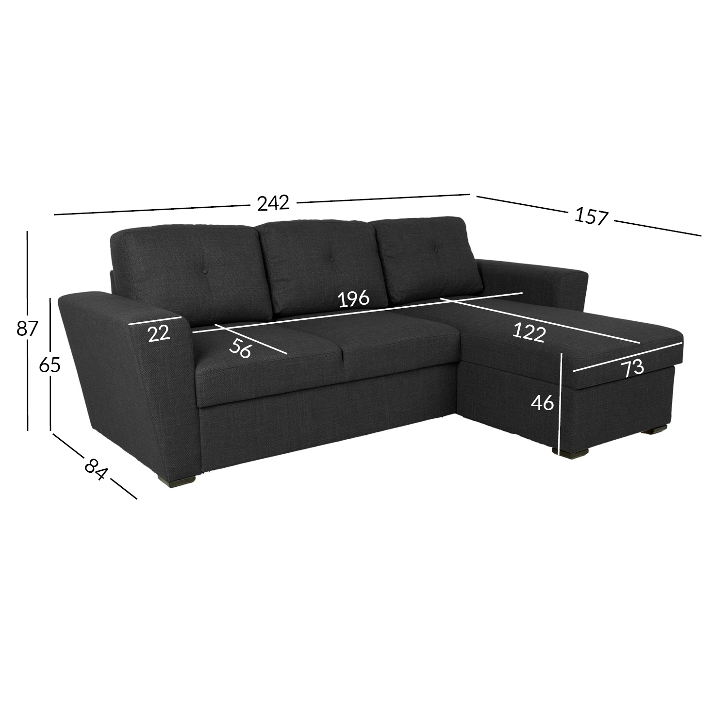 Diivani üldmõõdud on 242x157xH87cm. Istumissügavus on 56cm, istumiskõrgus 46cm. Magamisosa mõõdud avatuna 150x196cm.