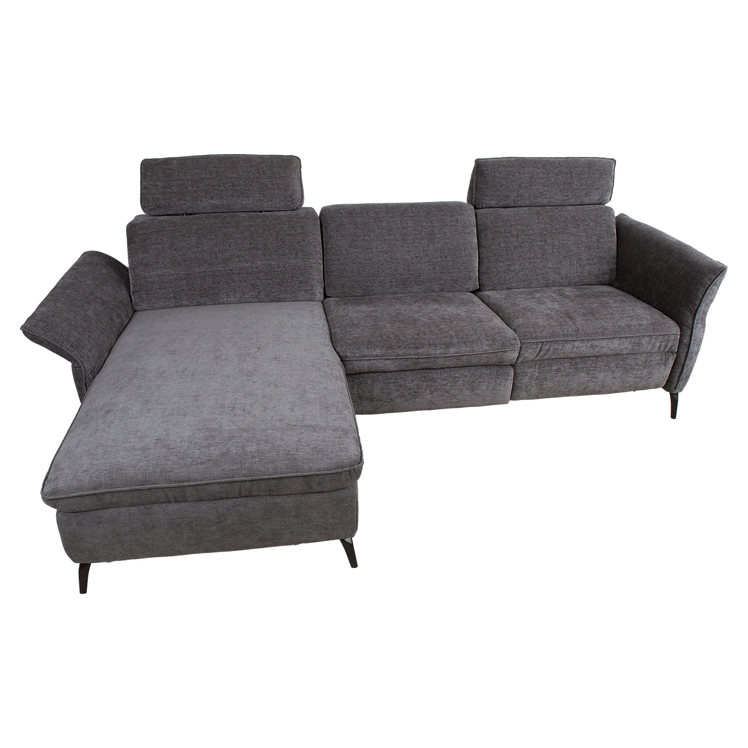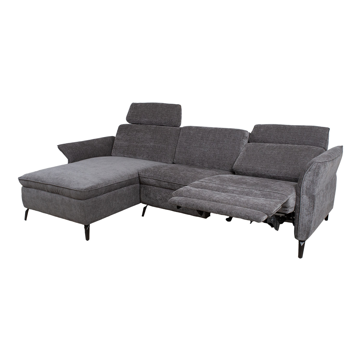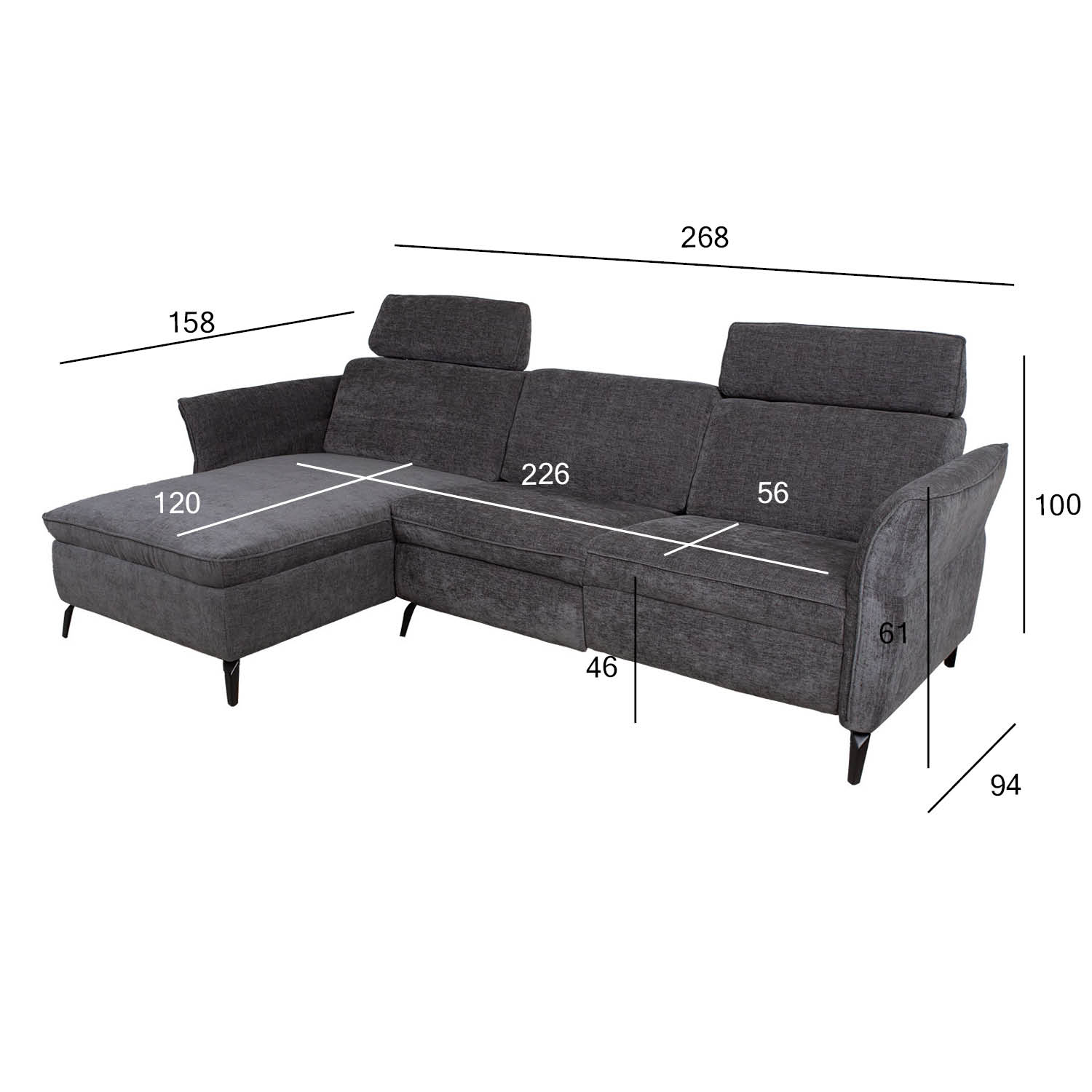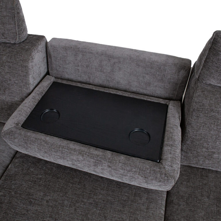 Nurgadiivan DAYTON VN, elektriline recliner, tumehall. Kaasaegse pehme mööbli juures on funktsionaalsus sama oluline, kui välimus ja mugavus. Diivani peatoed liiguvad üles-alla manuaalse mehhanismi abil. Parempoolse istme jalatoe asend on reguleeritav elektrilise mehhanismiga. Reguleerimisnupud asuvad istme ja käetoe vahel. Keskmise istme seljatoe saab muuta käepäraseks topsihoidjatega abilauaks. Lauaplaadi mõõdud on 58x32cm. Nurgaosa käetoe kõrgus on reguleeritav H60/70cm. Diivani karkass on valmistatud puidust ja vineerist. Polsterduseks on kasutatud polüuretaanvahtu. Diivan on üleni kaetud polüesterkangaga. Diivani üldmõõdud on 268×157/94xH80/100cm. Istme laius 226cm, istme sügavus 120/56cm, istme kõrgus 46cm. Diivanil on metallist jalad H13cm.