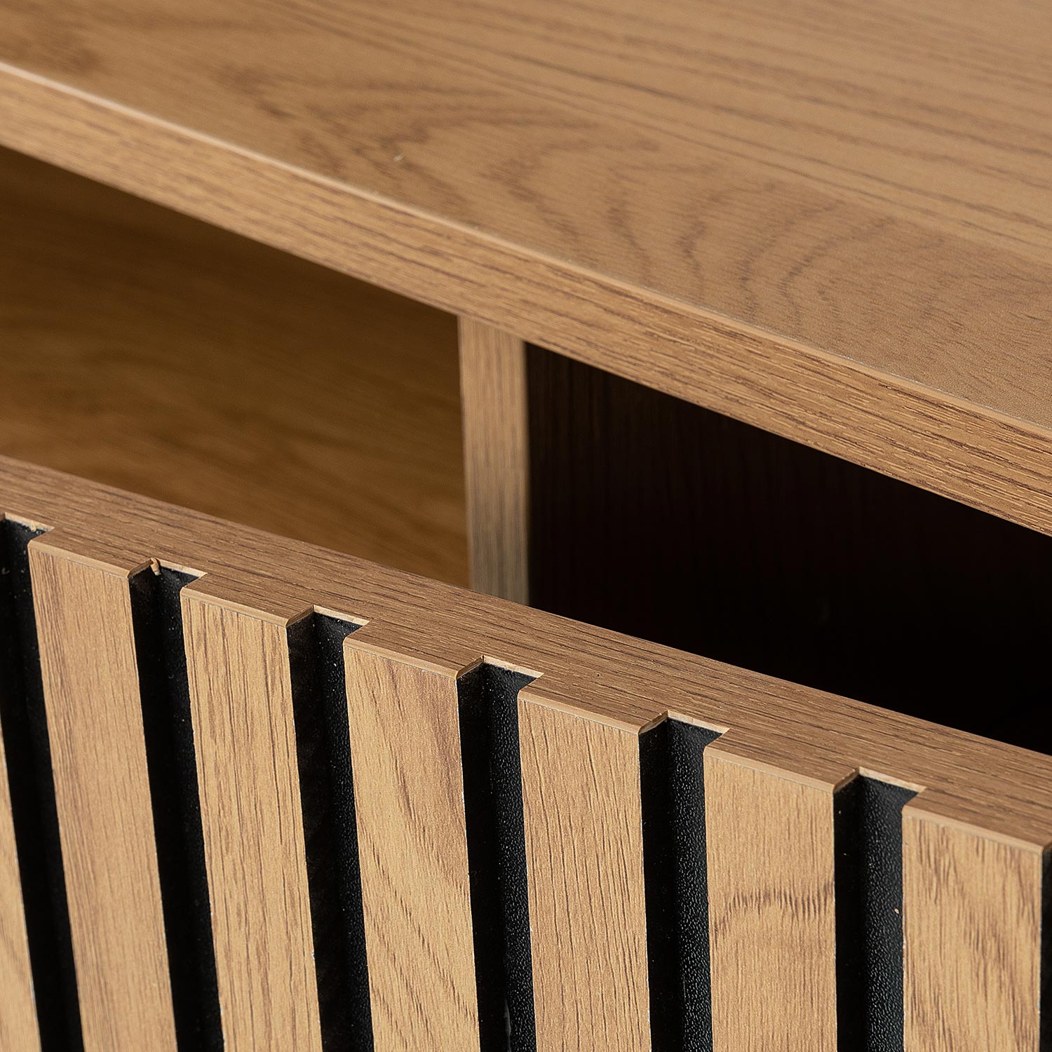 Uksepaneele kaunistavad kitsad tammevärvi MDF liistud mustal taustal.