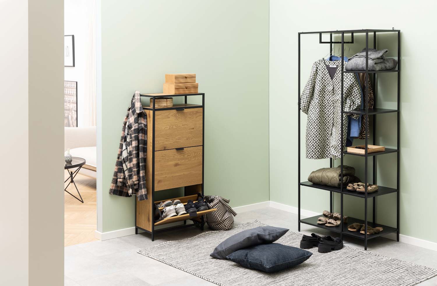 Jalanõudekapp pakub mugavat hoiuruumi jalanõudele ja lisab esikusse põrandapinda. Jalanõusid saab organiseeritult hoida kolmes sahtlis, millest igaüks on jaotatud kaheks osaks. Metsiku tamme välimus koos musta terasraamiga on kaasaegne kombinatsioon, mis sobib igasse koju. Mõõdud on 56x30xH129cm.