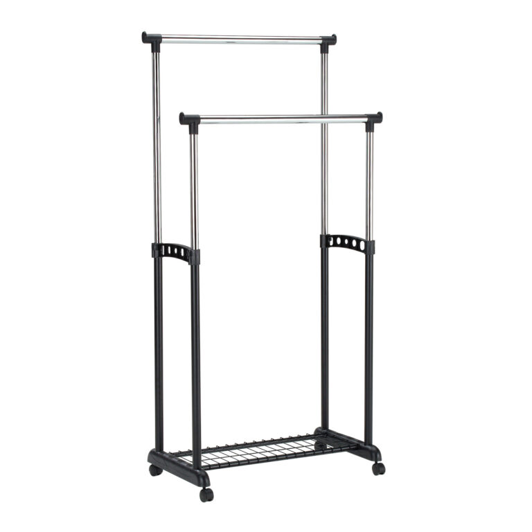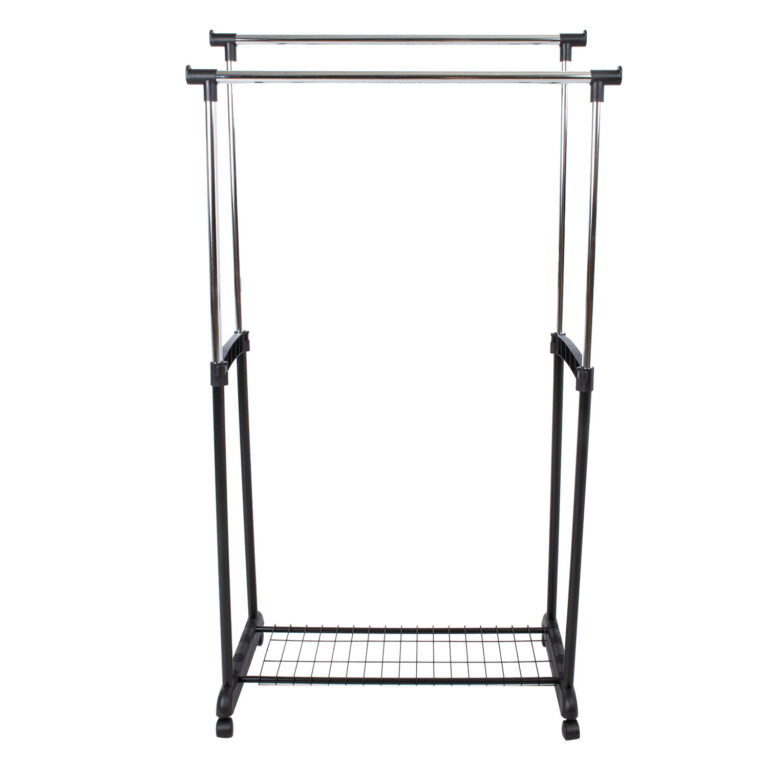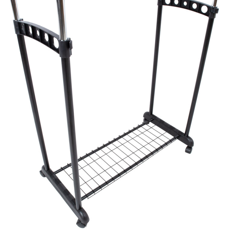 Ratastel liikuv, reguleeritava kõrgusega stange on lihtne ja praktiline lahendus riiete ja jalanõude organiseerimiseks.