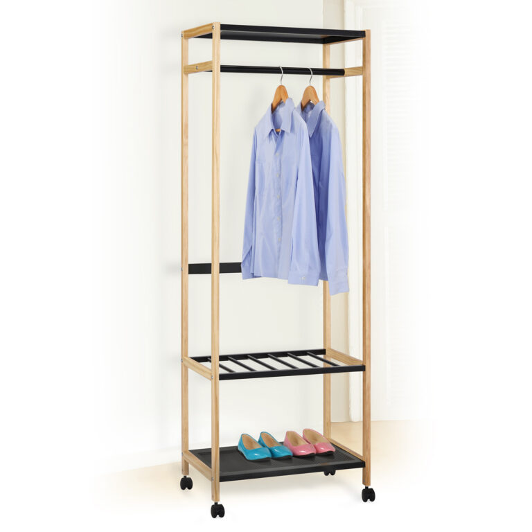 Esikuriiul FOREST 3-riiuliga 60x38xH170cm, naturaalne/must. Ratastel liikuv esikuriiul on praktiline ja mahutab palju. Riiuli karkass on valmistud puidust, metallist riiulid ja ripututoru on viimistletud musta pulbervärviga.