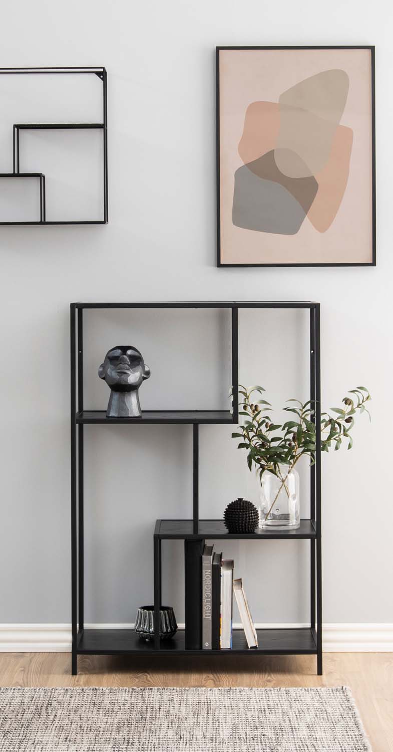 Riiul SEAFORD 77x35xH114cm. Raamaturiiul võimaldab vajalikke esemeid hoiustada, lisades samal ajal ruumi stiilse disainielemendi. Raamaturiiulil on isikupära, mis sobib paljude sisekujundusstiilidega. See sobib suurepäraselt kontorisse, kööki või elutuppa. Musta saare välimusega riiulitele saate paigutada kõik olulise. Must pulbervärvitud metallraam annab riiulile tööstusliku tunde. Riiulid: must saare melamiin, raam: metall, must. HOOLDUS: Üldjuhul vajavad melamiinpinnad vähe hoolt. Kasutage seebiveest kuivaks väänatud lappi ja pühkige pind kuivaks. Vältige küürimispulbri või nailonkäsnade kasutamist, kuna need pleegitavad või kriimustavad laminaati. Ärge hõõruge pinda kõvade esemetega.