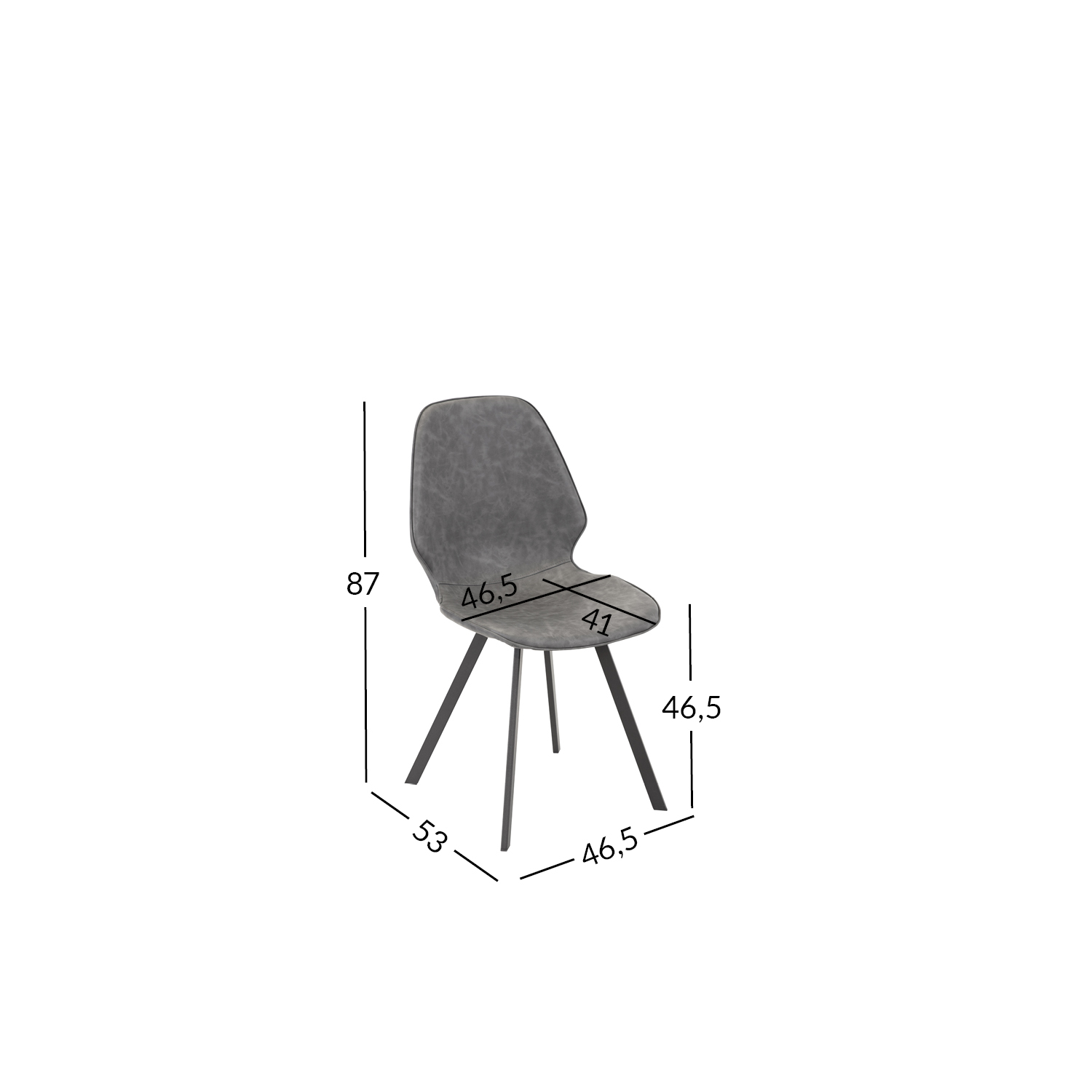 Tooli üldmõõdud on 46,5x53xH87cm, istme laius 46,5cm, istme sügavus 41cm, istme kõrgus 46,5cm, seljatoe kõrgus 44cm.