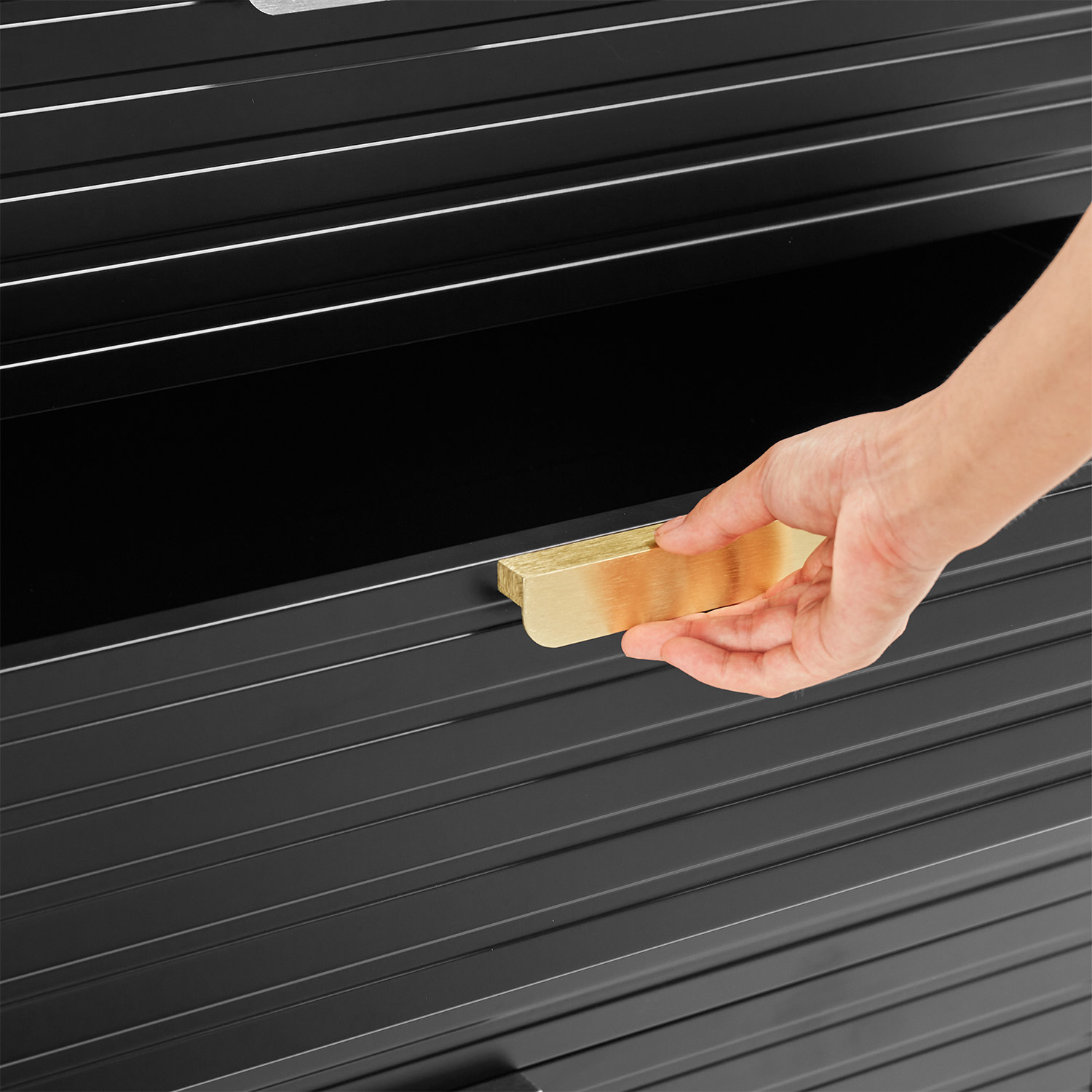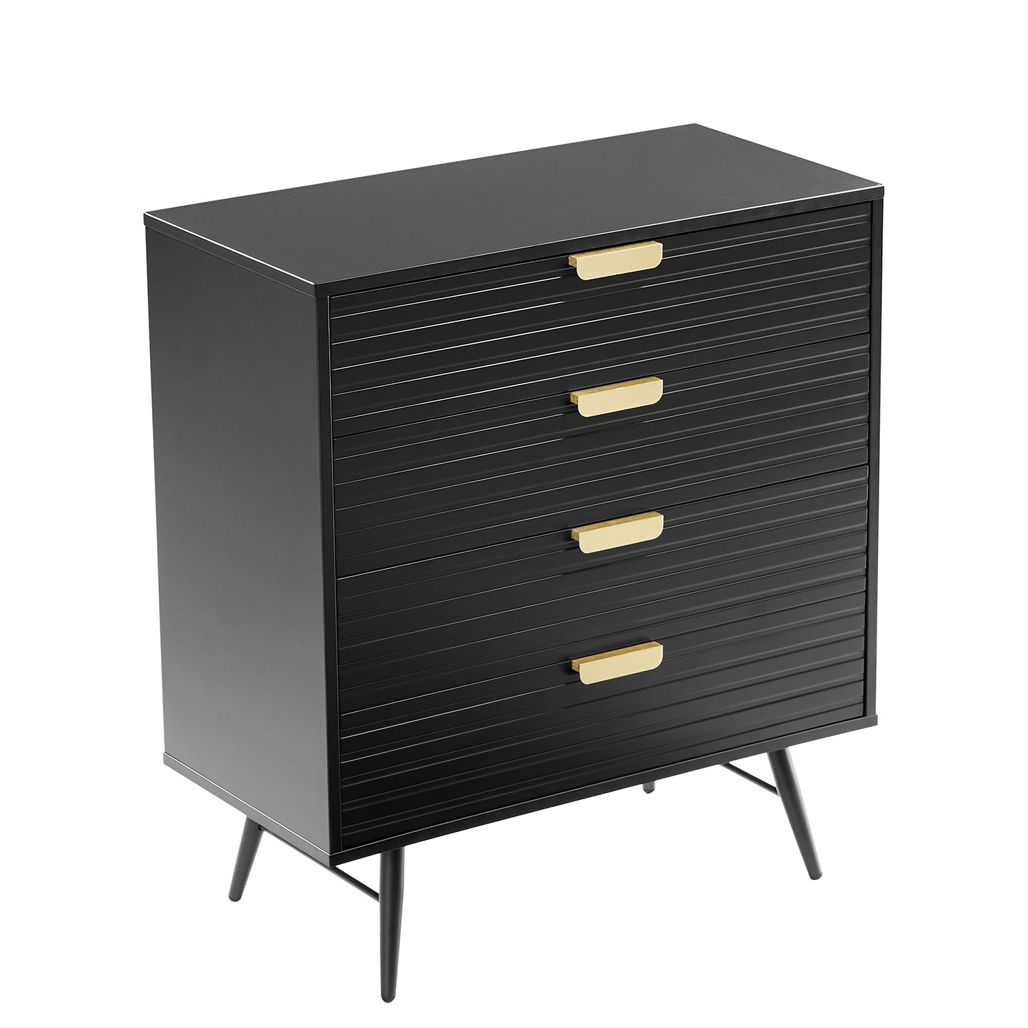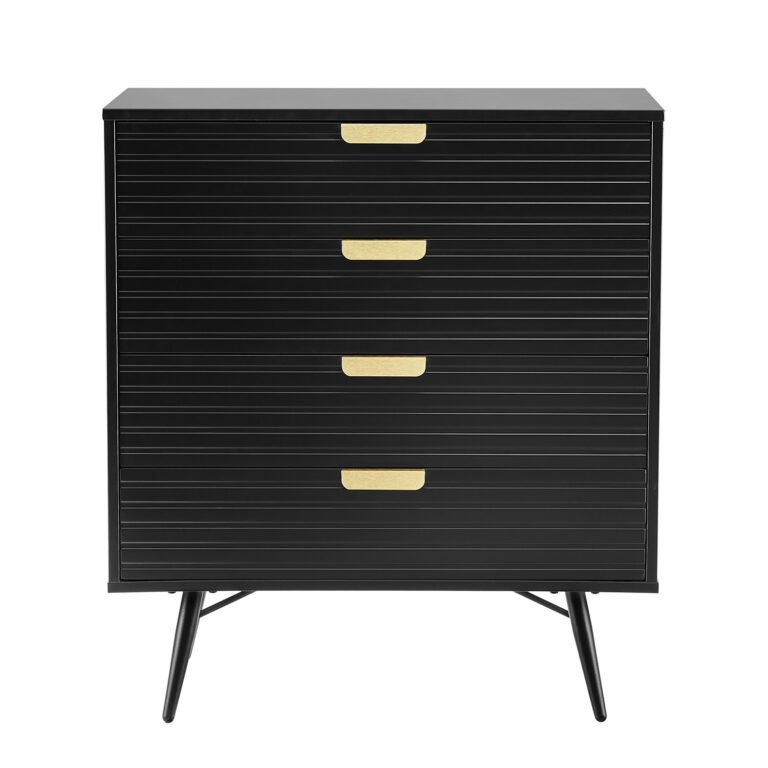 Kummut PIXAR 4-sahtliga 80x40xH90cm, must. Mööbliplaadist valmistatud kummut on viimistletud musta polüuretaanvärviga. Ribipaneelist sahtlite esipaneelid ning kuldsed käepidemed annavad kummutile pilkupüüdva välimuse. Kummuti jalad ja alusraam on valmistatud metallist.