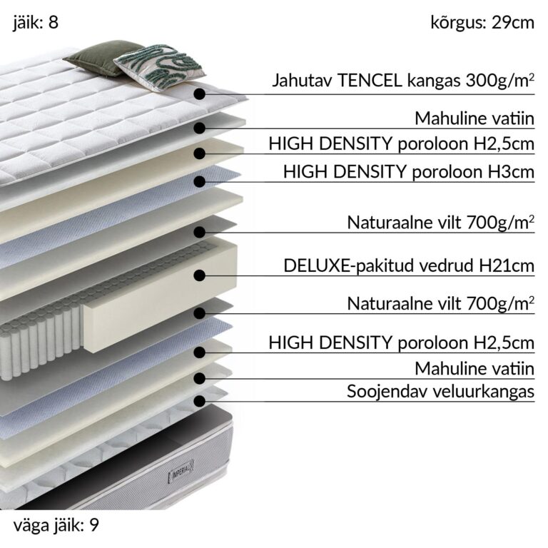 Vedrustus: DELUXE-pakitud vedrud 2,3mm/jäik, kõrgus 21cm. Vedruploki mõlemad pooled on kaetud 700g/m2 naturaalse vildikihiga.