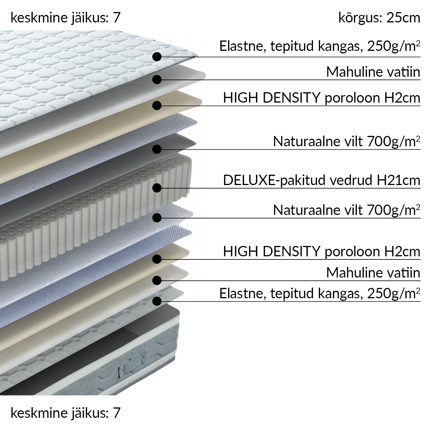 Vedrustus: 1,9mm pocket vedrud, kõrgus 21cm. Vedruploki mõlemad pooled on kaetud 700g vildikihiga.