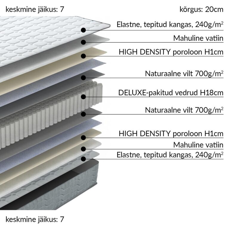 Vedrustus: 1,9mm pocket vedrud, kõrgus 18cm. Vedruploki mõlemad pooled on kaetud 700g vildikihiga.