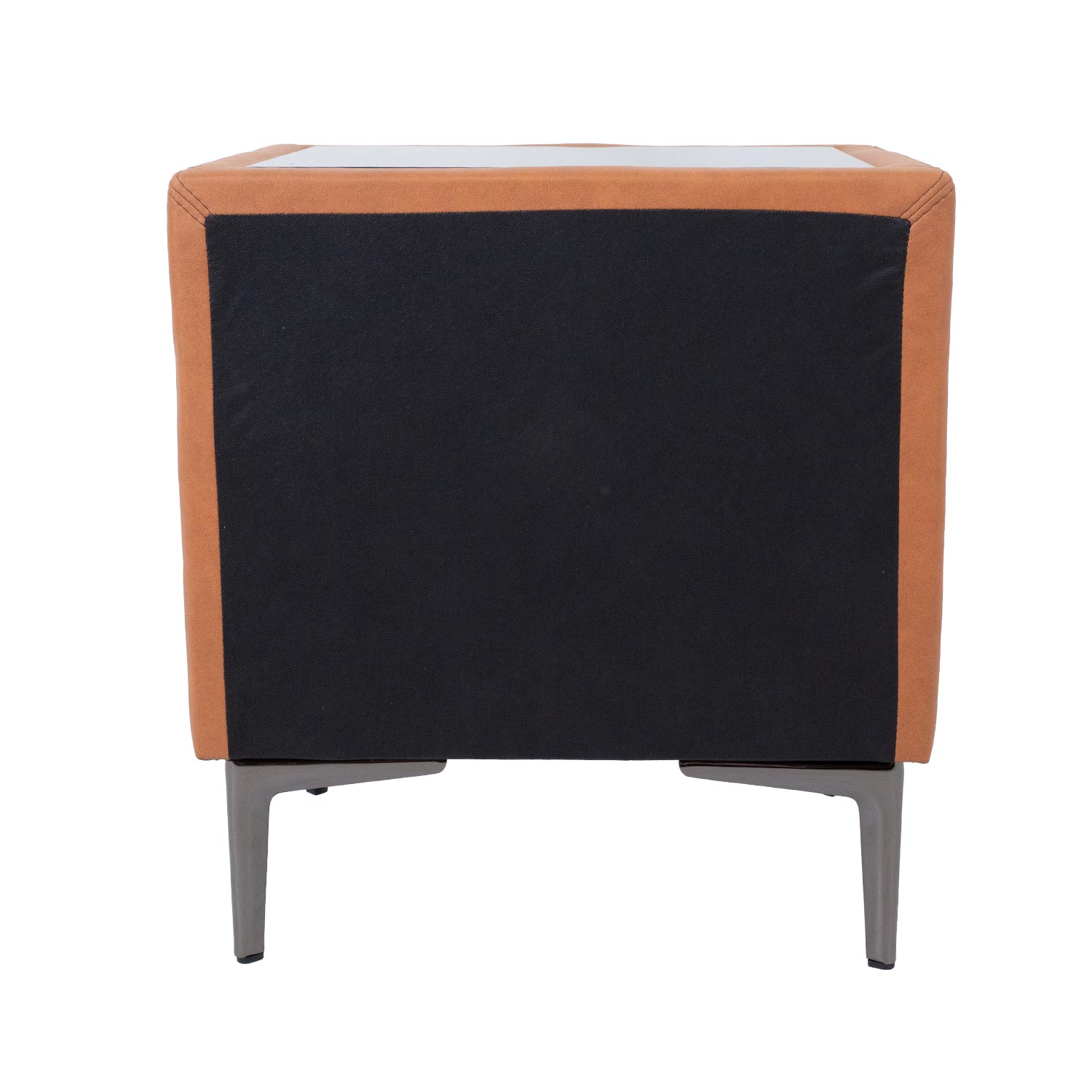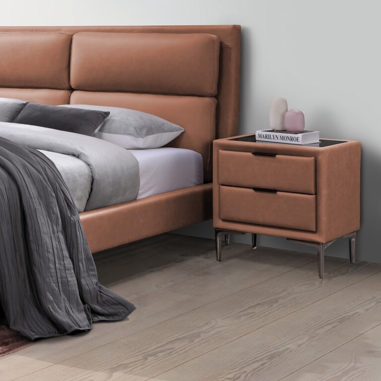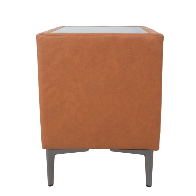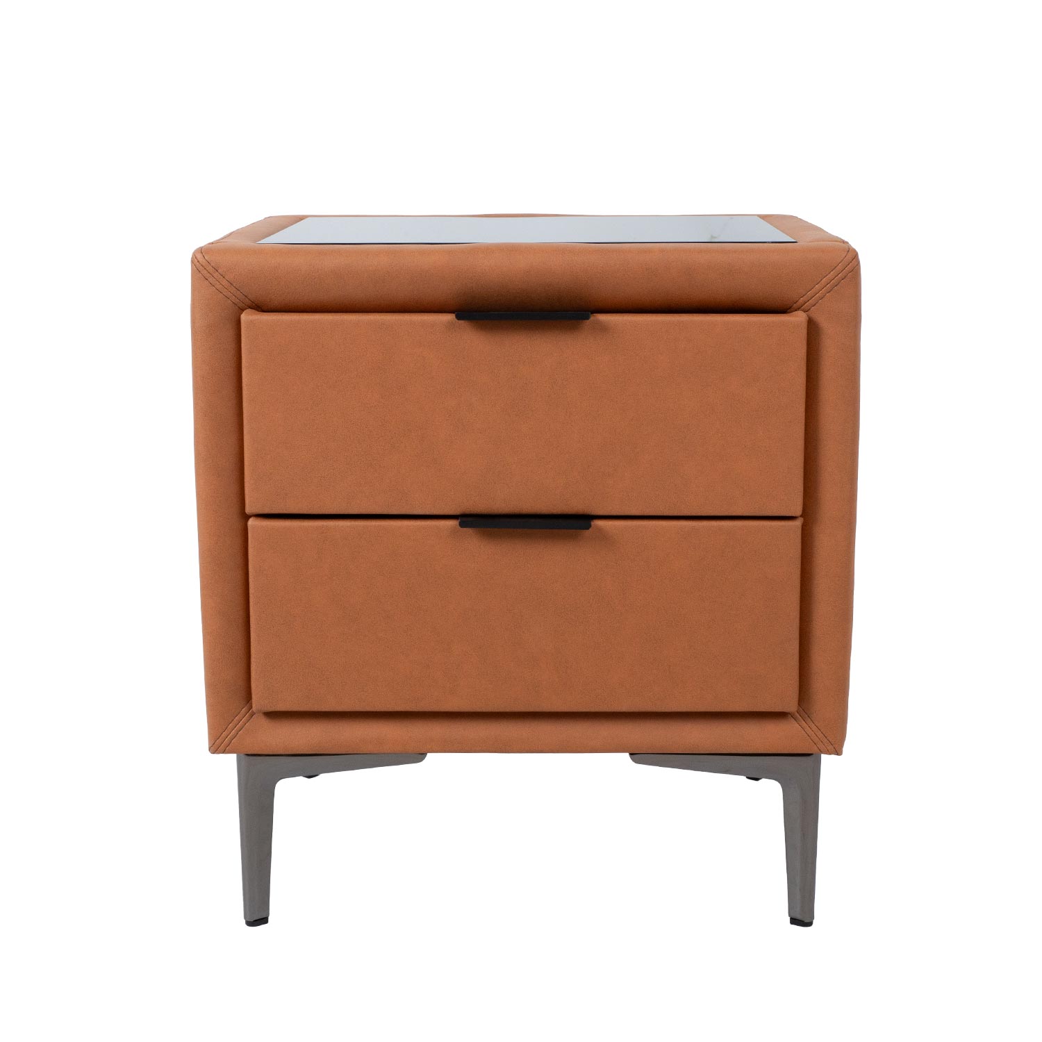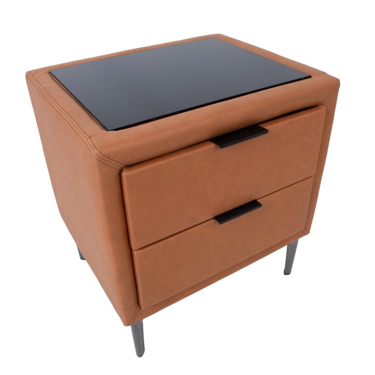 Öökapp LENA 2-sahtliga 50,5x41xH54cm, konjakipruun. Öökapi korpus on valmistatud mööbliplaadist ja kaetud uudse kunstnahka meenutava materjaliga (Leathaire), mis ühendab endas naha kauni tekstuuri ning kanga soojuse. Leathaire on ideaalne mööblikattematerjal, sest on hästi hingav, vett hülgav, kriimustuste kindel ning väga vastupidav. Öökapi peal on tume karastatud klaasist plaat. Öökapil on tumedad metallist jalad ja sahtlite käepidemed.