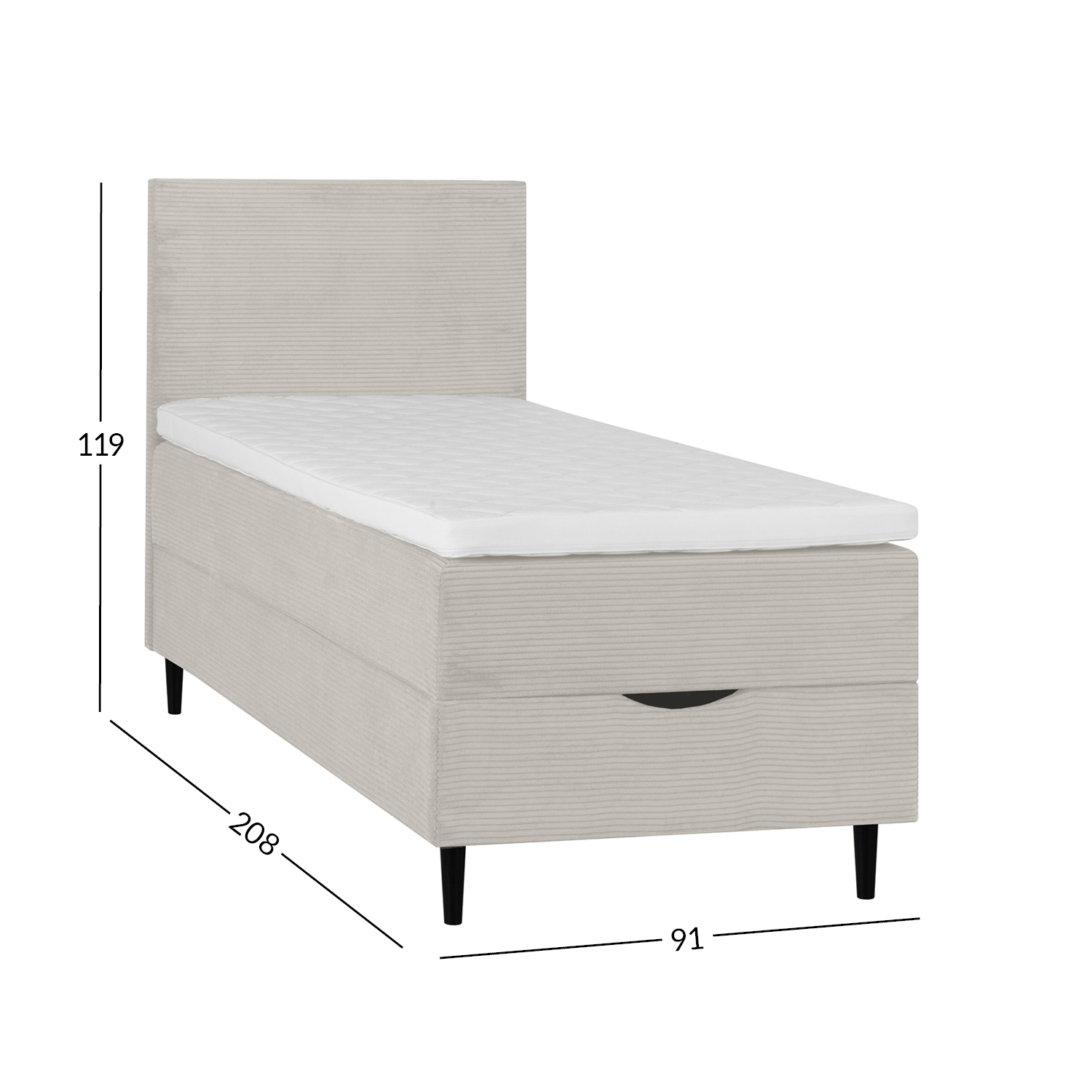 Voodi kattemadrats on poroloonist ja selle paksus on 7cm. Kattemadratsi all asub pocket-vedrustusega madrats. 210vedru/m2, vedru kõrgus 13cm. Madratsi jäikus: keskmine. Voodi raam on valmistatud puidust, puitlaast- ja puitkiudplaadist. Voodi all asub ruumikas panipaik. Voodijalad on valmistatud puidust, 14cm kõrged. Voodipeats on voodiga sama lai, selle paksus on 7cm, kõrgus 105cm. Ühenduselemendid on lisatud. Voodi kõrgus maast on 70cm. Toote mõõdud on 91x208xH119cm.