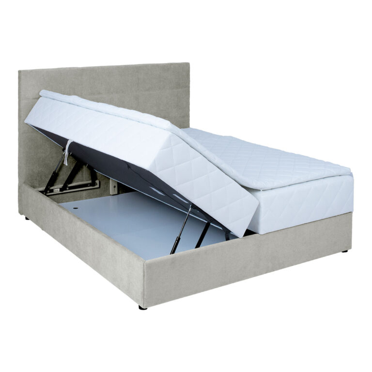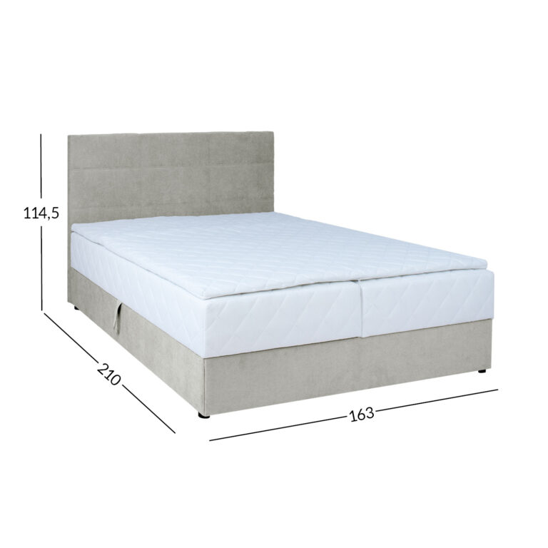 Voodil on pocket-vedrustusega madrats, 210 vedru/m2. Vedrude kõrgus on 13cm. Vedrusid katab 23kg/m3 poroloonikiht, mis on 2cm paks. Madratsi jäikus: jäik. Kattemadratsi sisuks on 23kg/m3 poroloon. Kattemadrats on kaetud 200g/m2 polüestervatiiniga. Voodi all on mahukas panipaik, mis on valmistatud täispuidust ja lamineeritud puitlaastplaadist. Selle küljed on kaetud porolooniga. Voodi karkass on valmistatud täispuidust. Voodiraam on kaetud kangaga, 30 000 Martindale´i. Komplekti kuulub voodipeats, mis on voodiga sama lai. Peatsi paksus on 7cm. Kaasas on ühenduselemendid peatsi kinnitamiseks voodi külge. Voodil on neli plastikust jalga, mis on musta värvi. Voodijalgade kõrgus on 2,5cm, kattemadratsi kõrgus 4cm, madratsi kõrgus 16cm. Voodi magamispinna kõrgus on 52cm. Toote mõõdud on 163x210x114,5cm. Toode on valmistatud EL-is.