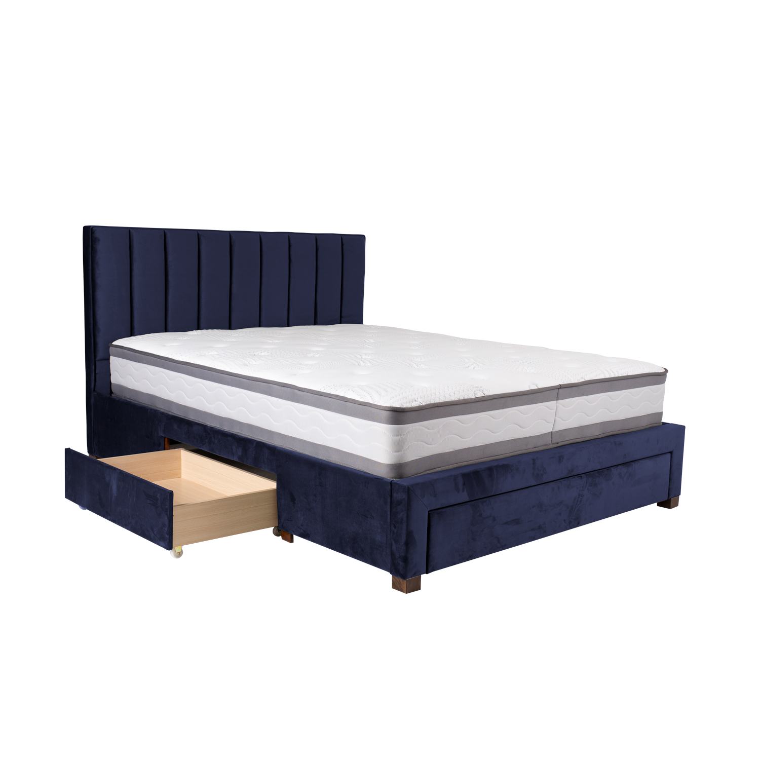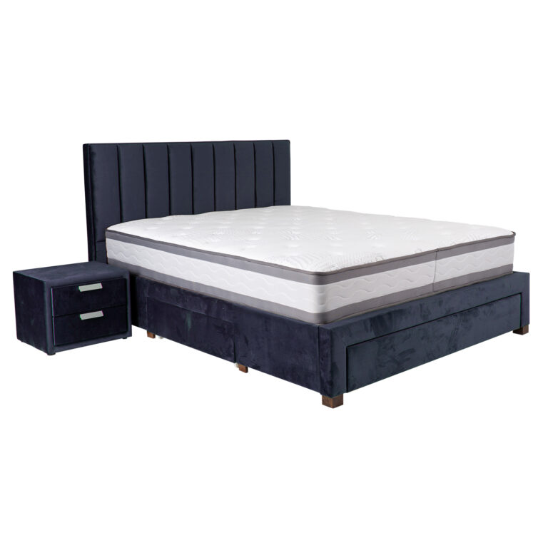 Voodi korpus on valmistatud MDF plaadist ja kaetud meresinise polüesterkangaga.